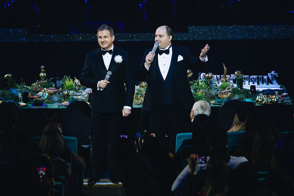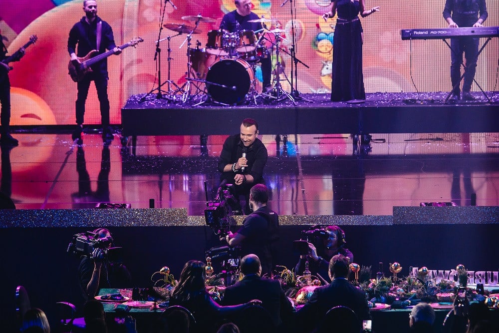 До слова, Руслан Сенічкін, який вів концерт разом із Людмилою Барбір, теж з’явився оригінально: в центрі столу з однієї страви Людмила вирішила зняти кришку і побачила там голову свого співведучого. Зрештою Руслан зайняв місце за столом. Приємним сюрпризом для всіх став також ліричний перфоманс суперфіналістів «Танців з зірками» Ксенії Мішиної з Євгеном Котом та Анни Різатдінової із Олександром Прохоровим, які станцювали під виступ співачки katya, раніше відомої як Асоль.