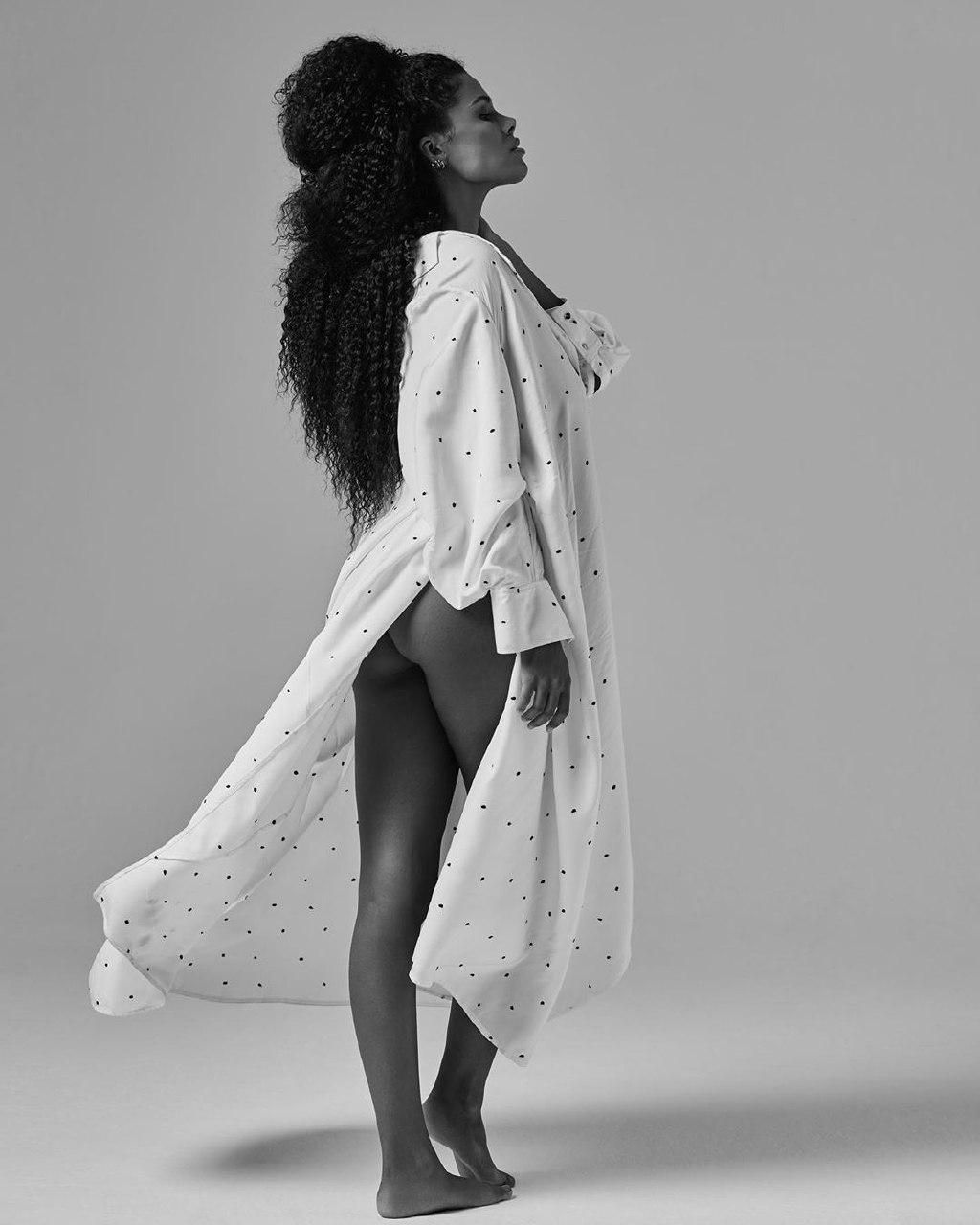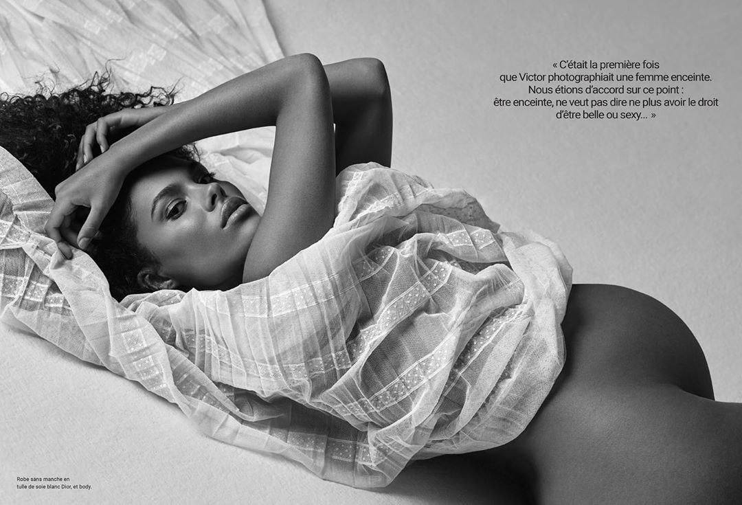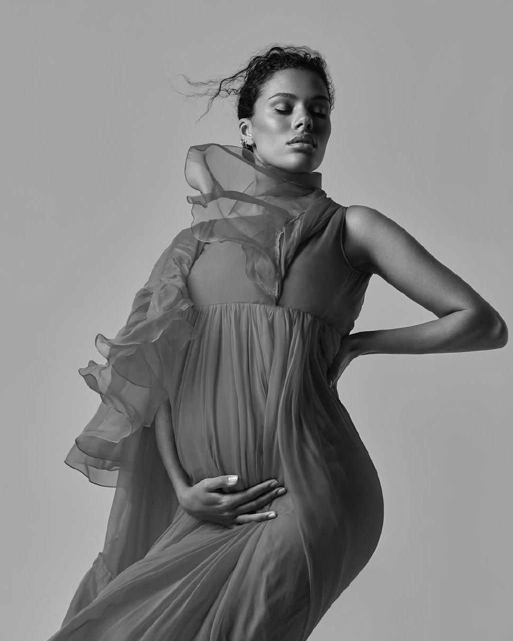 Та днями модель нарешті потішила шанувальників серією чорно-білих світлин. На них вона позує як у легких сукнях, які підкреслюють вагітний животик, так і повністю оголеною.