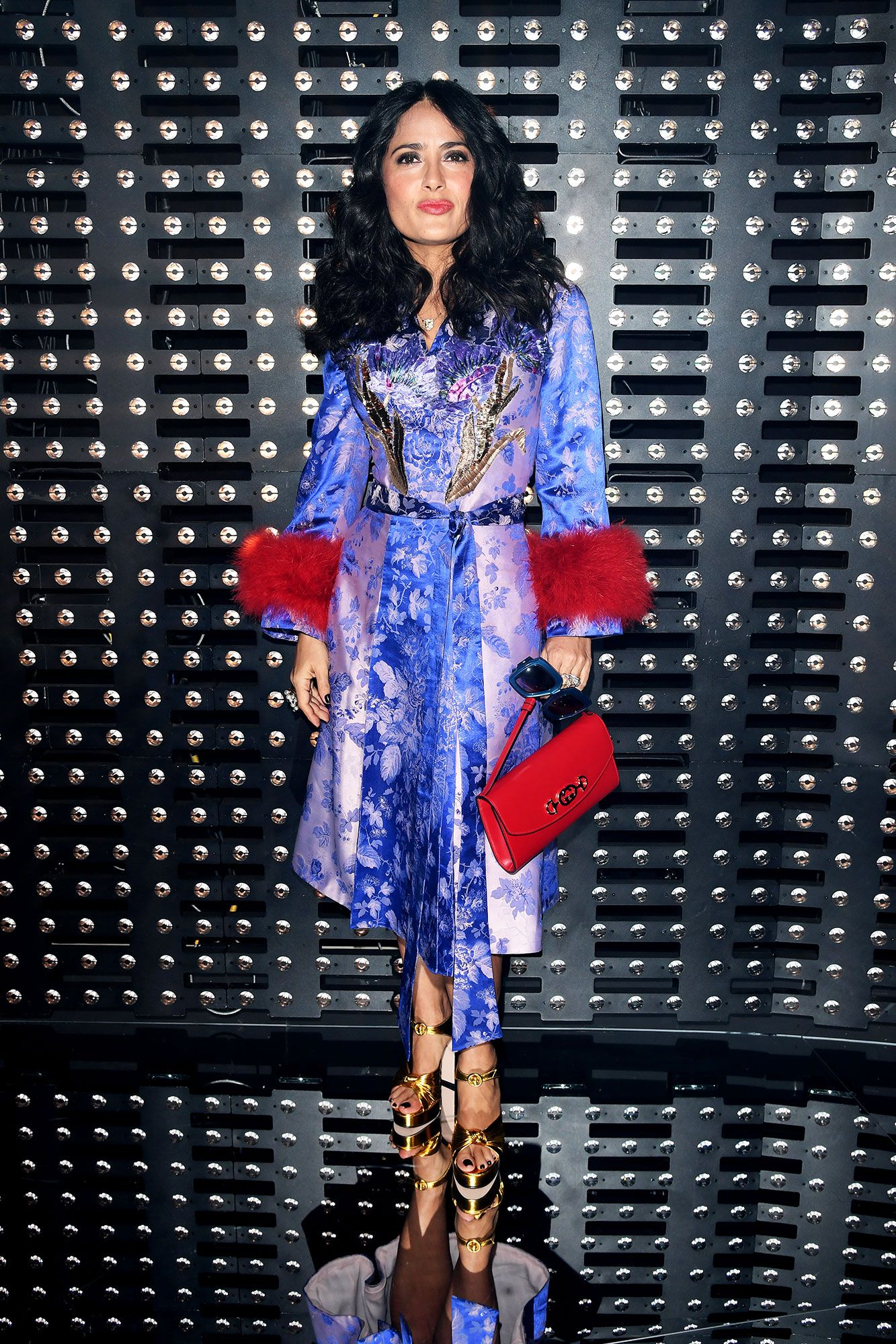 Акторка одягнула жакардову блакитну сукню із золотою вишивкою і об’ємними манжетами з фарбованого хутра. Доповнила ефектний образ Сальма Гаєк сумочкою такого ж кольору, як хутро, сонцезахисними окулярами і туфлями на високих підборах.