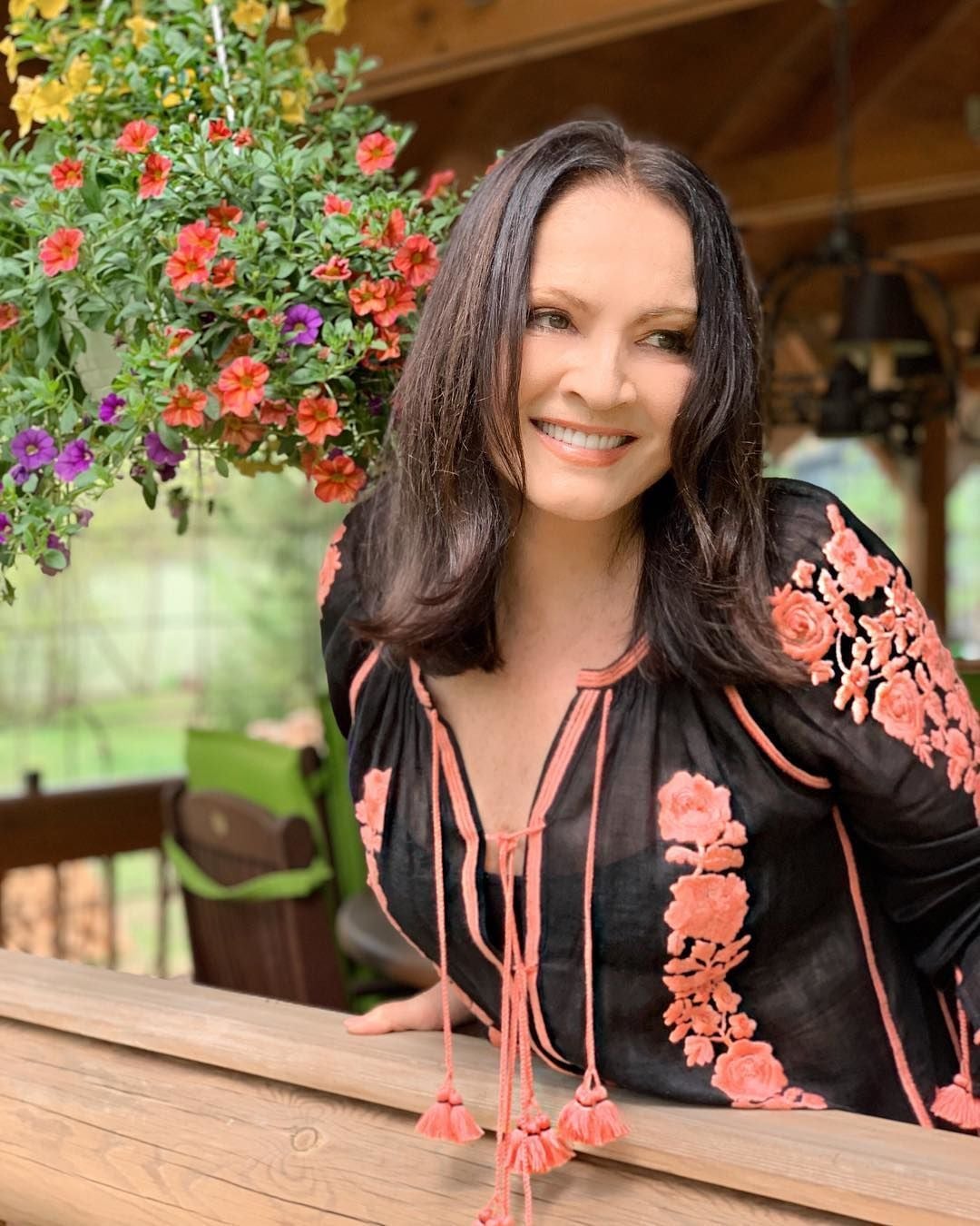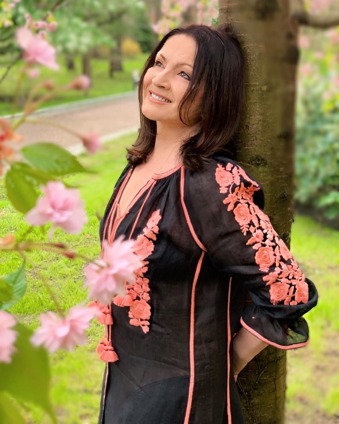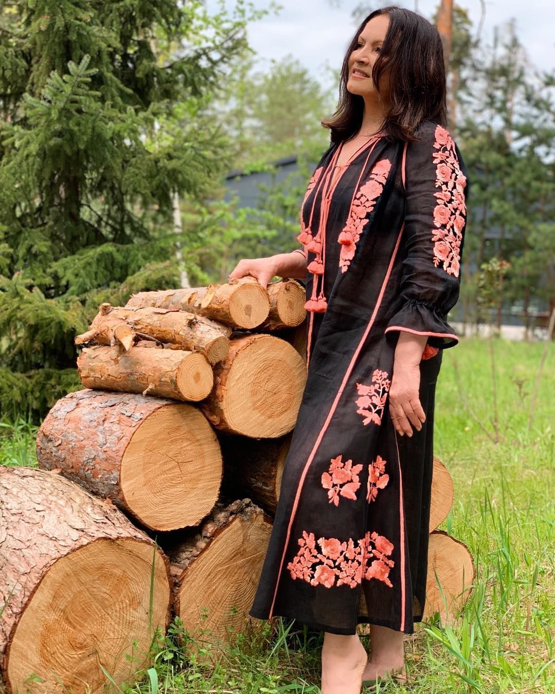 На фото 71-річна Софія позує серед цвіту в напівпрозорій чорній сукні, вишитій кораловими квітами.