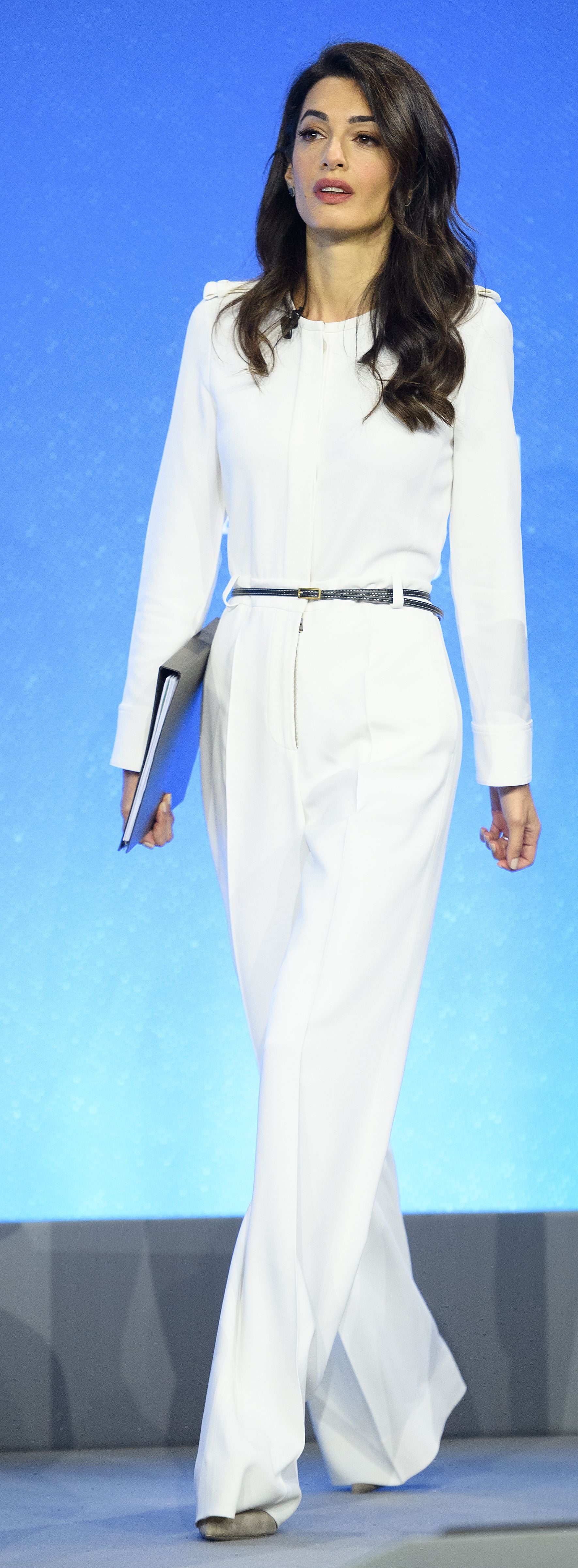Амаль продемонструвала стильний білий комбінезон та сірі човники. Із аксесуарів на ній був лише тонкий чорний пояс на талії та лаконічні сережки.