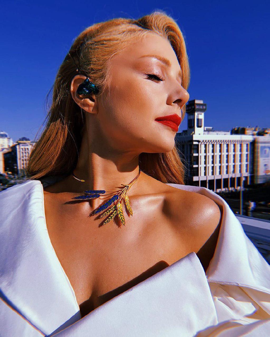 Барв total white вбранню додали червоні вуста та елегантні аксесуари. Шию Тіни прикрасило золоте кольє від українського бренду Guzema Jewelry у вигляді жовто-блакитних колосків — як прапор України.