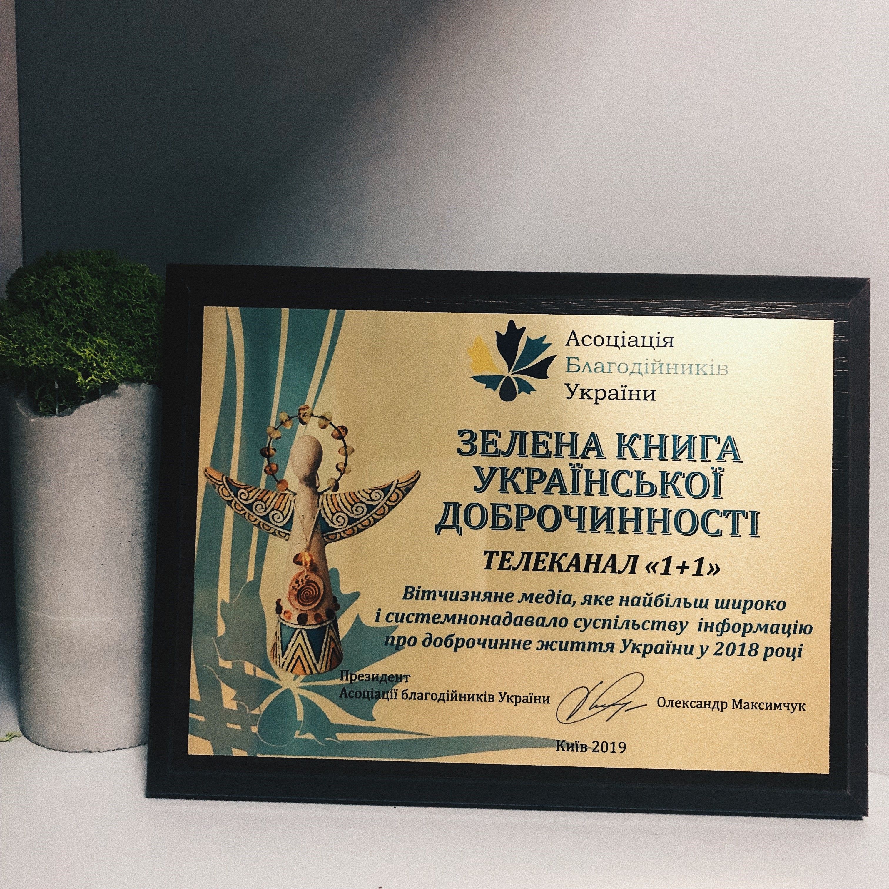 Телеканал 1+1 було відзначено нагородою від Асоціації благодійників України як вітчизняне медіа, яке найбільш широко і системно надавало суспільству інформацію про доброчинне життя України у 2018 році.