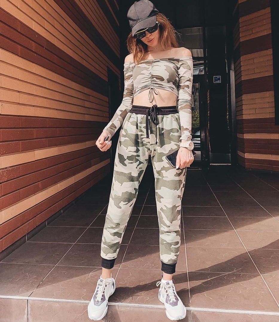 Адаптувати стиль мілітарі до щоденного літнього образу вдалося і Наді Дорофєєвій. Артистка опублікувала фото, на якому позує в камуфляжних спортивних штанах із чорними манжетами, поєднавши їх зі звабливим топом такої ж палітри. На завершення – зручні білі кросівки та чорна кепка.