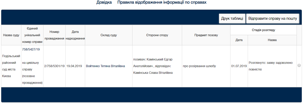 Інформація про розірвання шлюбу з’явилась на офіційному сайті Подільського районного суду міста Києва. Статус розгляду справи було змінено з «Призначено до судового розгляду» на «Заяву задоволено повністю».