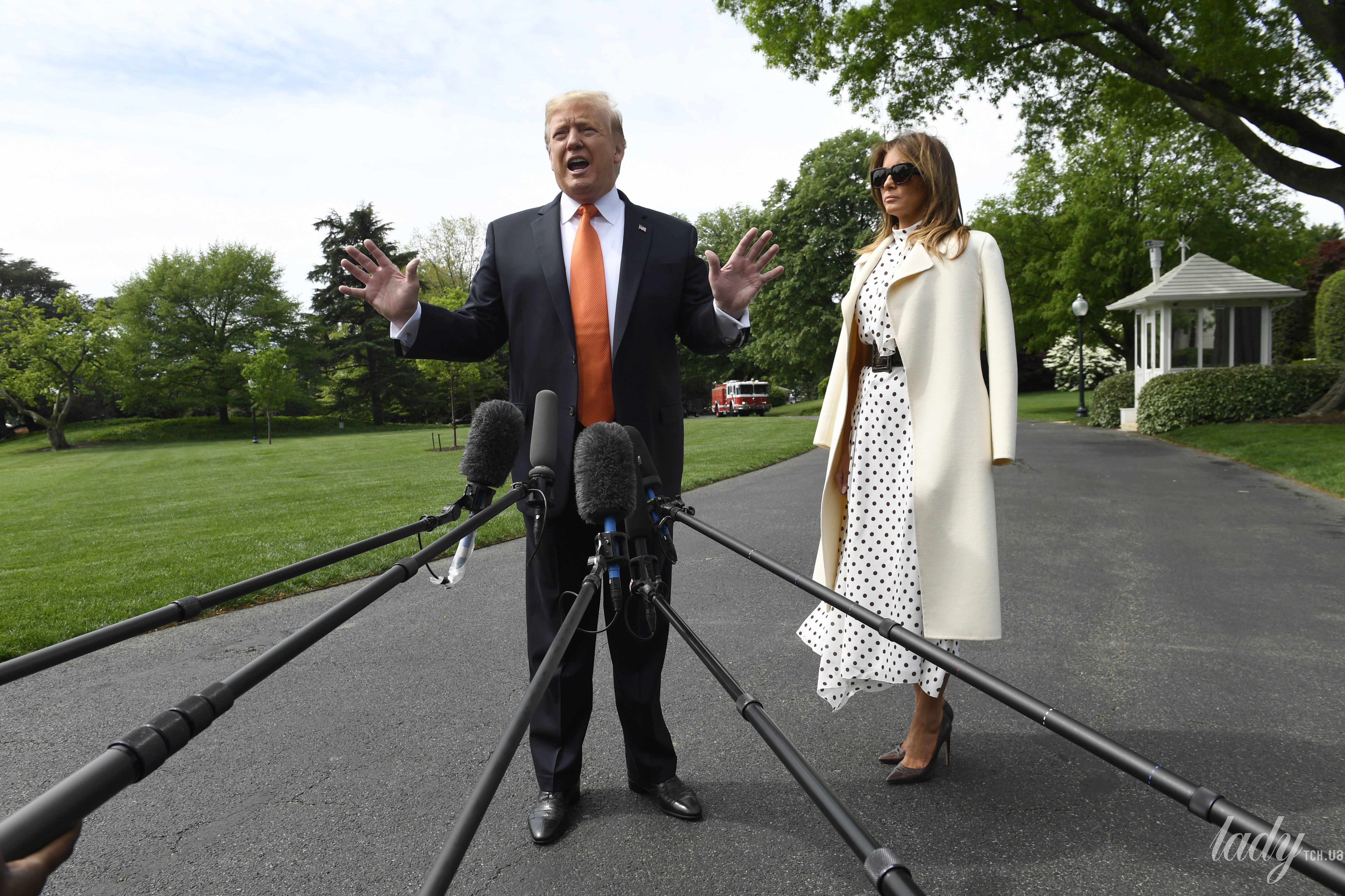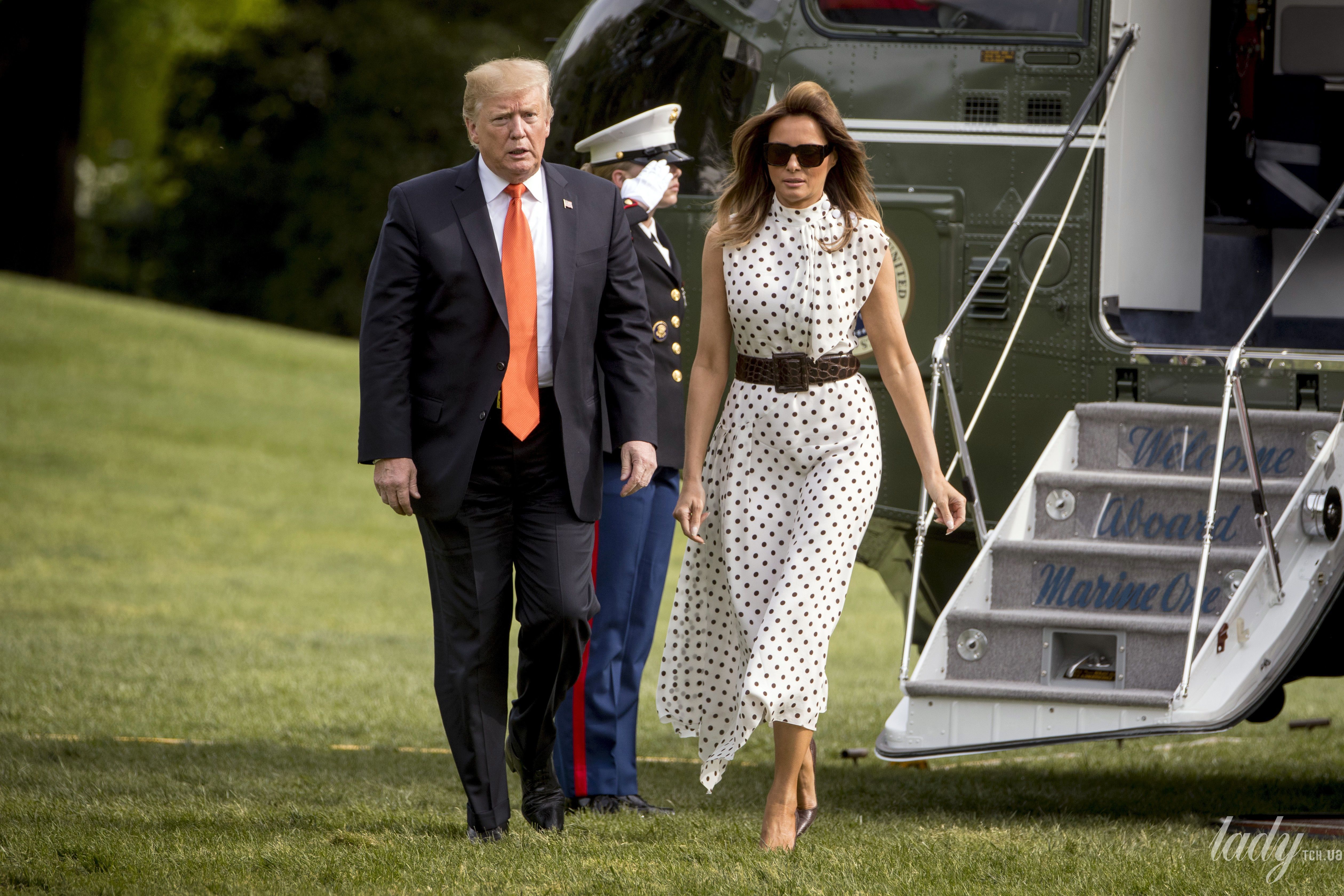 Аби супроводити свого чоловіка Дональда Трампа на конференцію до Атланти, Меланія вбралася у білу сукню асиметричного крою від Alessandra Rich у трендовий гороховий принт. Одна деталь її весняного луку - широкий пояс зі шкіри крокодила - став головним акцентом й ідеально підкреслив тонку талію першої леді. Меланія також доповнила образ коричневими пітоновими туфлями Manolo Blahnik, пальто молочного відтінку і стильними окулярами.