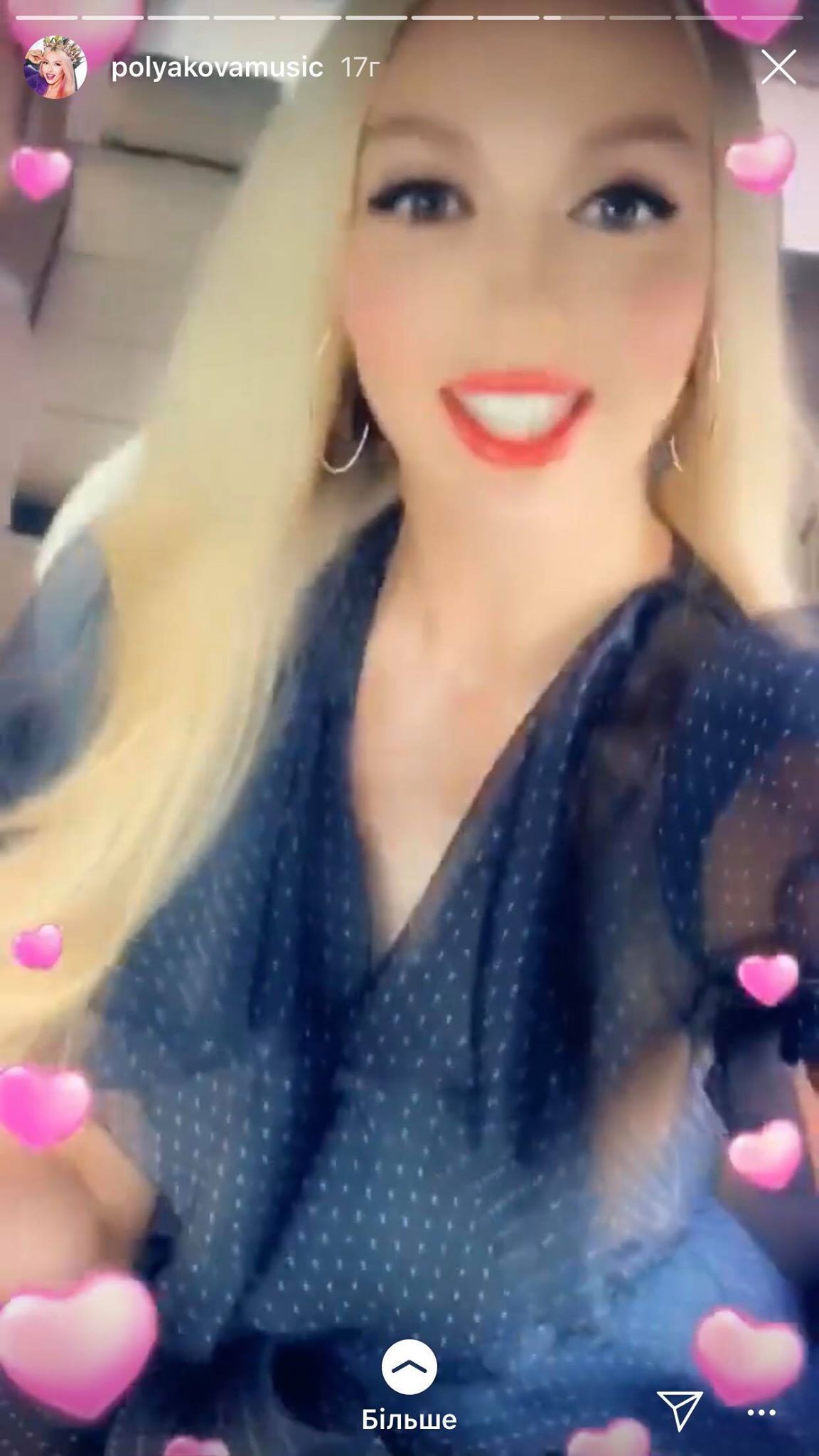 Співачка Оля Полякова обрала для святкової події напівпрозору сукню в горох. Зірка зробила акцент у макіяжі на червоні губи.