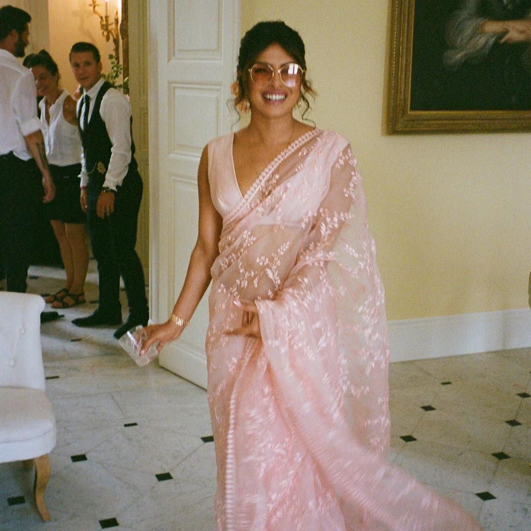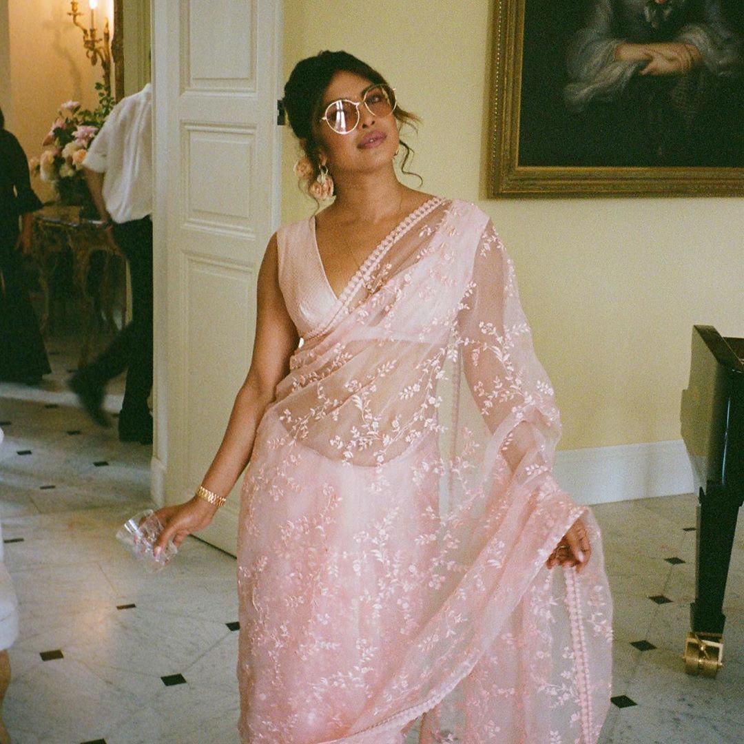 Її чоловік написав теплі слова привітання та поділився фото коханої. На світлинах Чопра позує в напівпрозорому вишитому сарі пудрового кольору.