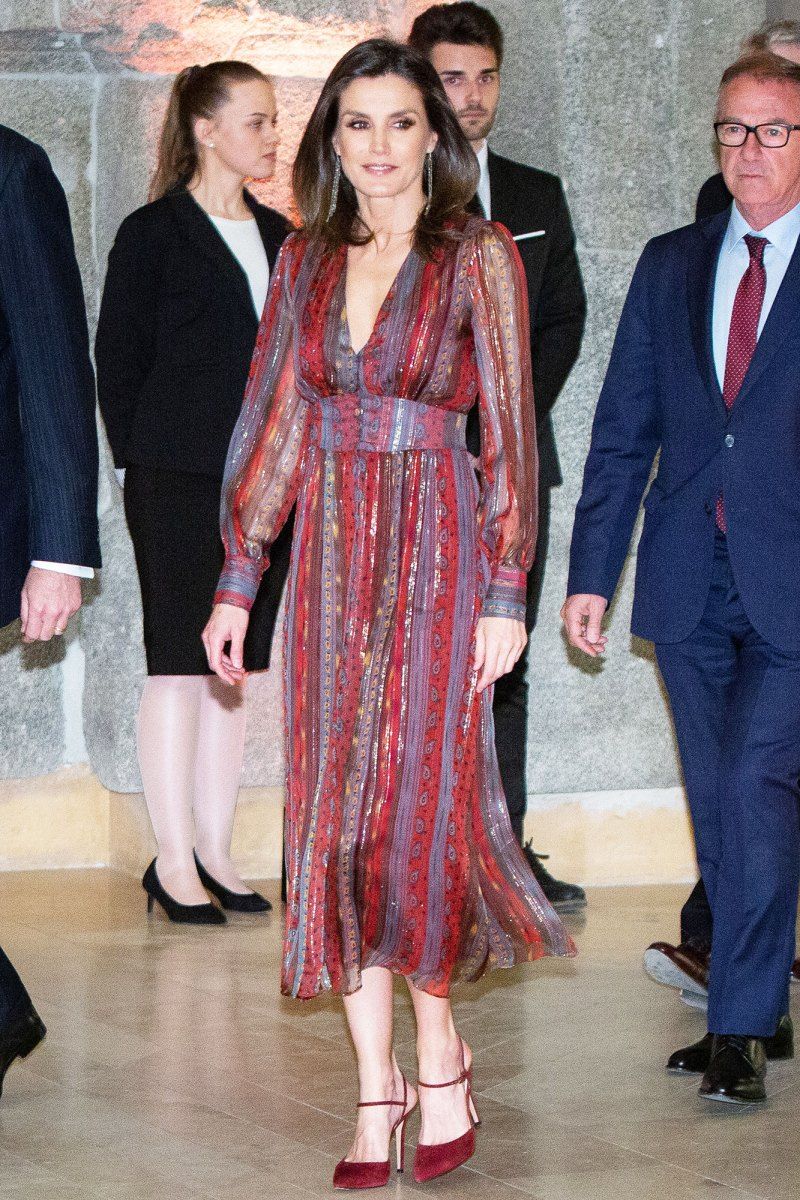 Цього тижня перша леді Іспанії, королева Летиція стала гостею Національної премії в галузі культури в Мадриді. Для урочистого заходу дружина Філіпа VІ обрала просту, але цікаву шифонову сукню зі східними мотивами та вельми глибоким вирізом. Приталене вбрання вдало підкреслило струнку фігуру Летиції.