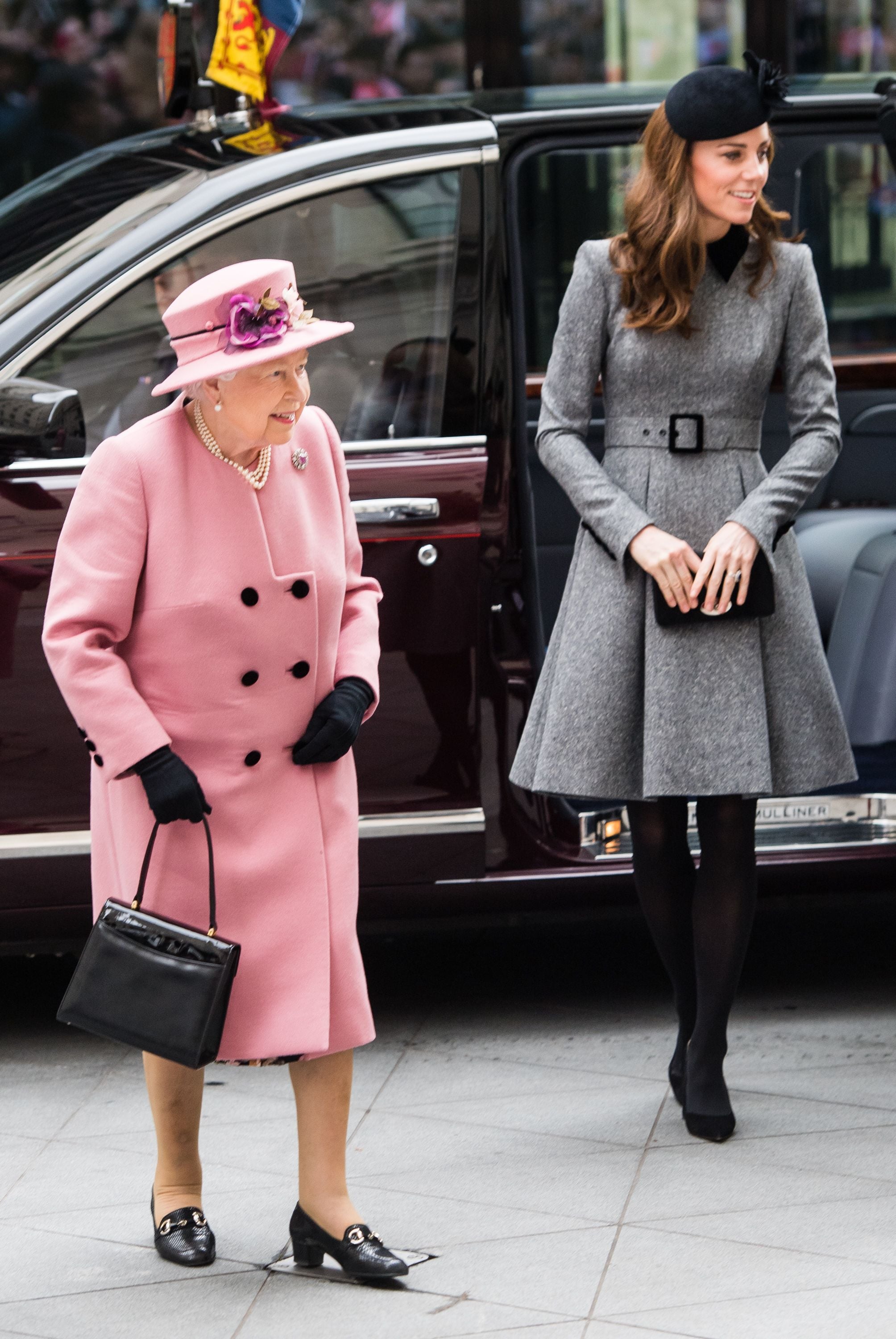 Обоє мали чарівний вигляд. Так, Кетрін з’явилася у стриманій сірій сукні Catherine Walker, чорних туфлях, з елегантним капелюшком та клатчем. Їй контрастувала королева, яка обрала ніжно-рожеве пальто Stewart Parvin з чорними гудзиками та капелюх у тон, декорований квітами. Її образ доповнили чорні туфлі, рукавички, прикраси з перлин і коштовна брошка.