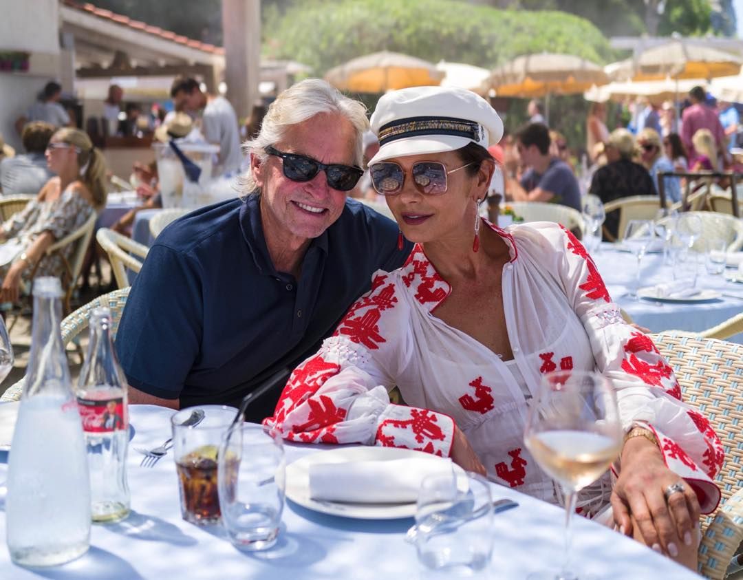 На фото Кетрін позує разом із чоловіком, 74-річним актором Майклом Дугласом. На ній — напівпрозора біла вишиванка з яскраво-червоним орнаментом. Акторка доповнила літній образ класичними окулярами та кеппі.