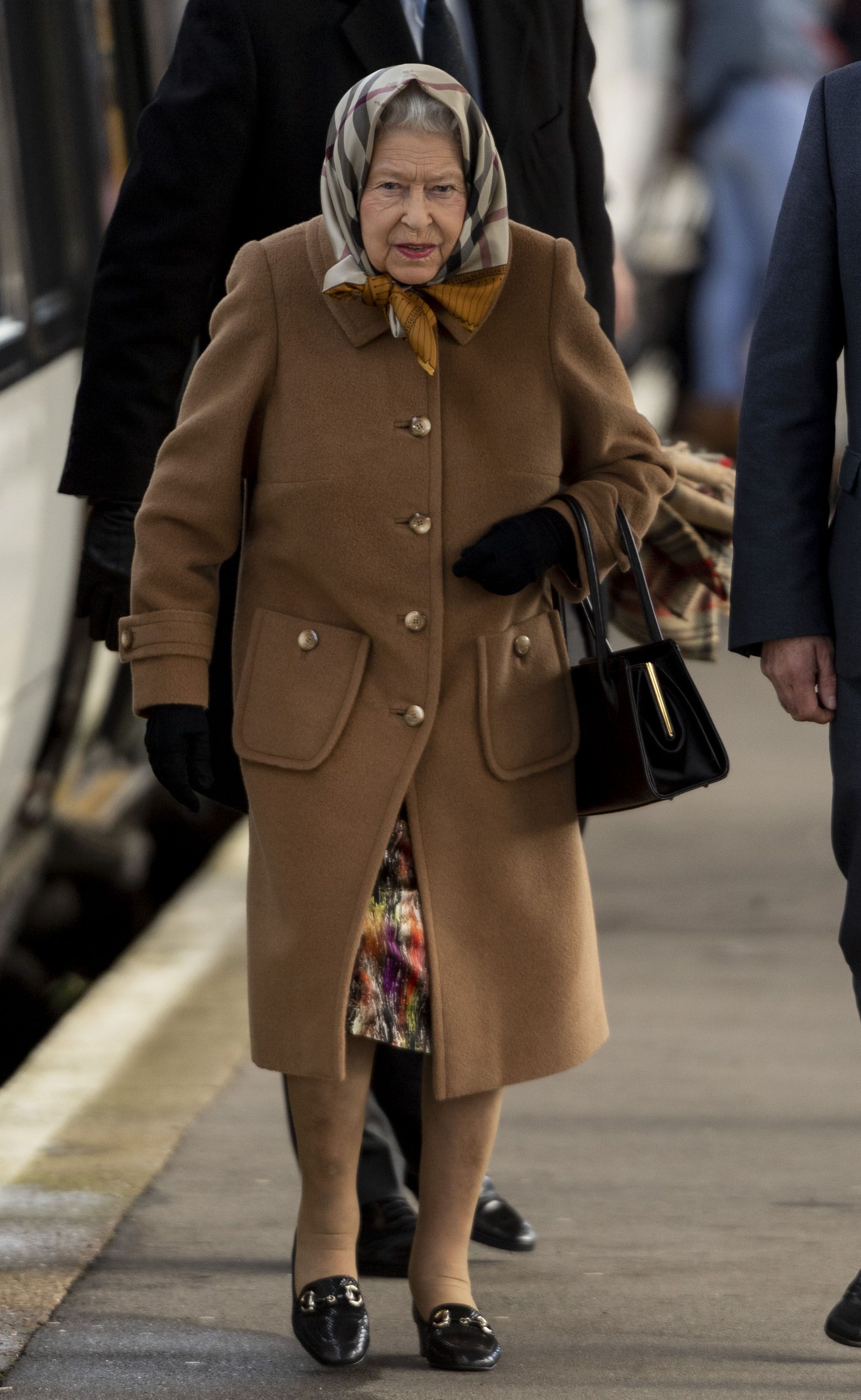 Для святкової подорожі Єлизавета вбралася у тепле пальто кольору кемел, а також замінила улюблений капелюшок на стильну хустинку від Burberry. Її Величність доповнила образ чорним взуттям, класичною сумкою й рукавицями.