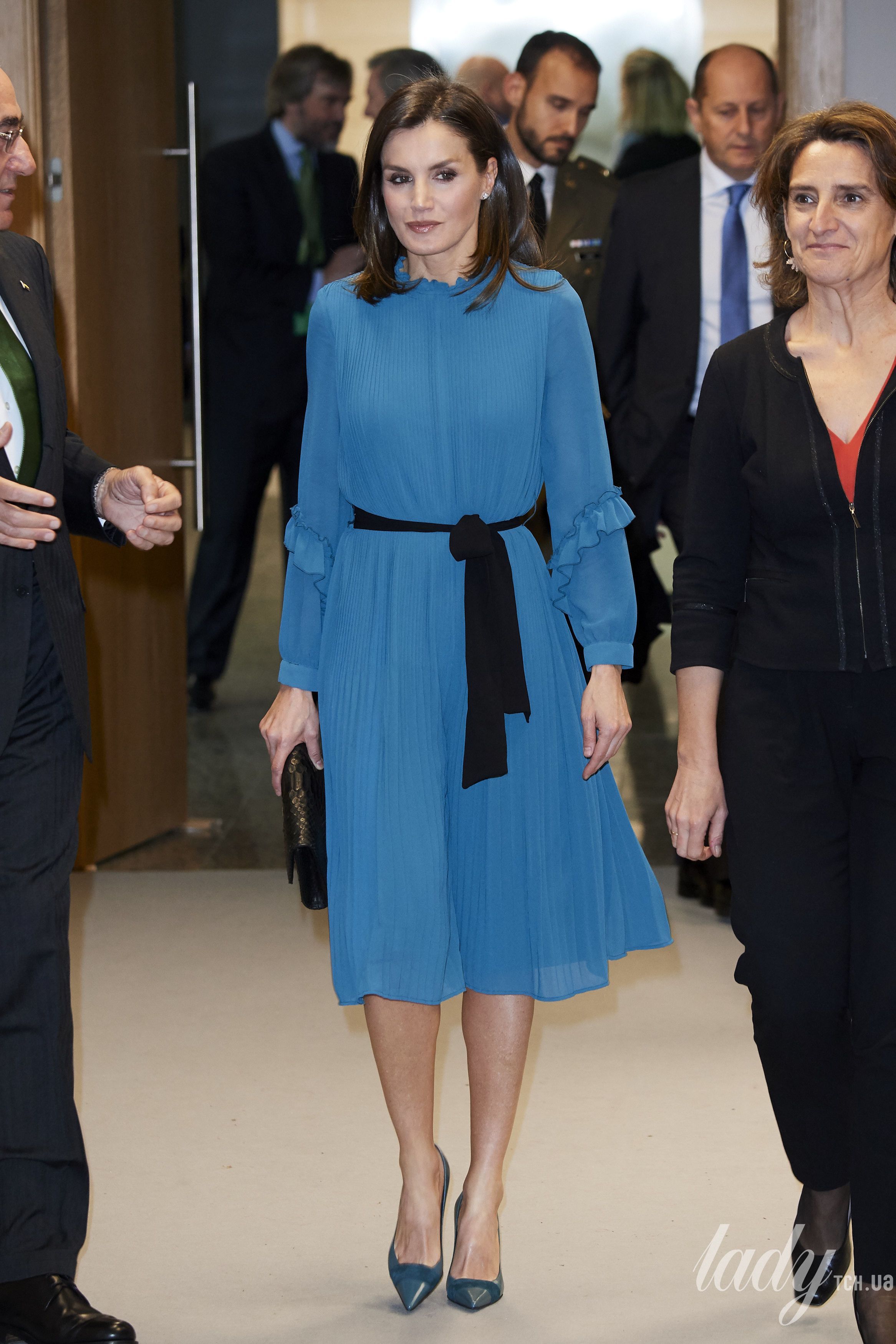 Дружина короля Філіпа VI відвідала урочисту церемонію вручення грантів на магістерську і дослідницьку допомогу Фонду Iberdrola. Для заходу Летиція обрала синю сукню з чорним поясом від бренду Zara. Придбати її можна на офіційному сайті всього за 13 доларів.