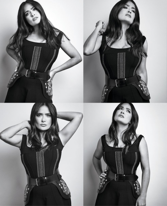 Також зірка приміряла й інший образ — більш зухвалий. На чорно-білих знімках Сальма у обтислому комбінезоні зі шкіряним ременем-баскою.