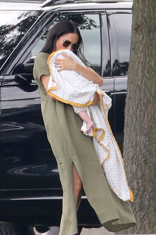 Меган Маркл у вільній сукні кольору хакі та чорних сонцезахисних окулярах тримала Арчі на руках. Гаррі був одягнений у спортивну форму для поло та йшов поряд із дружиною.