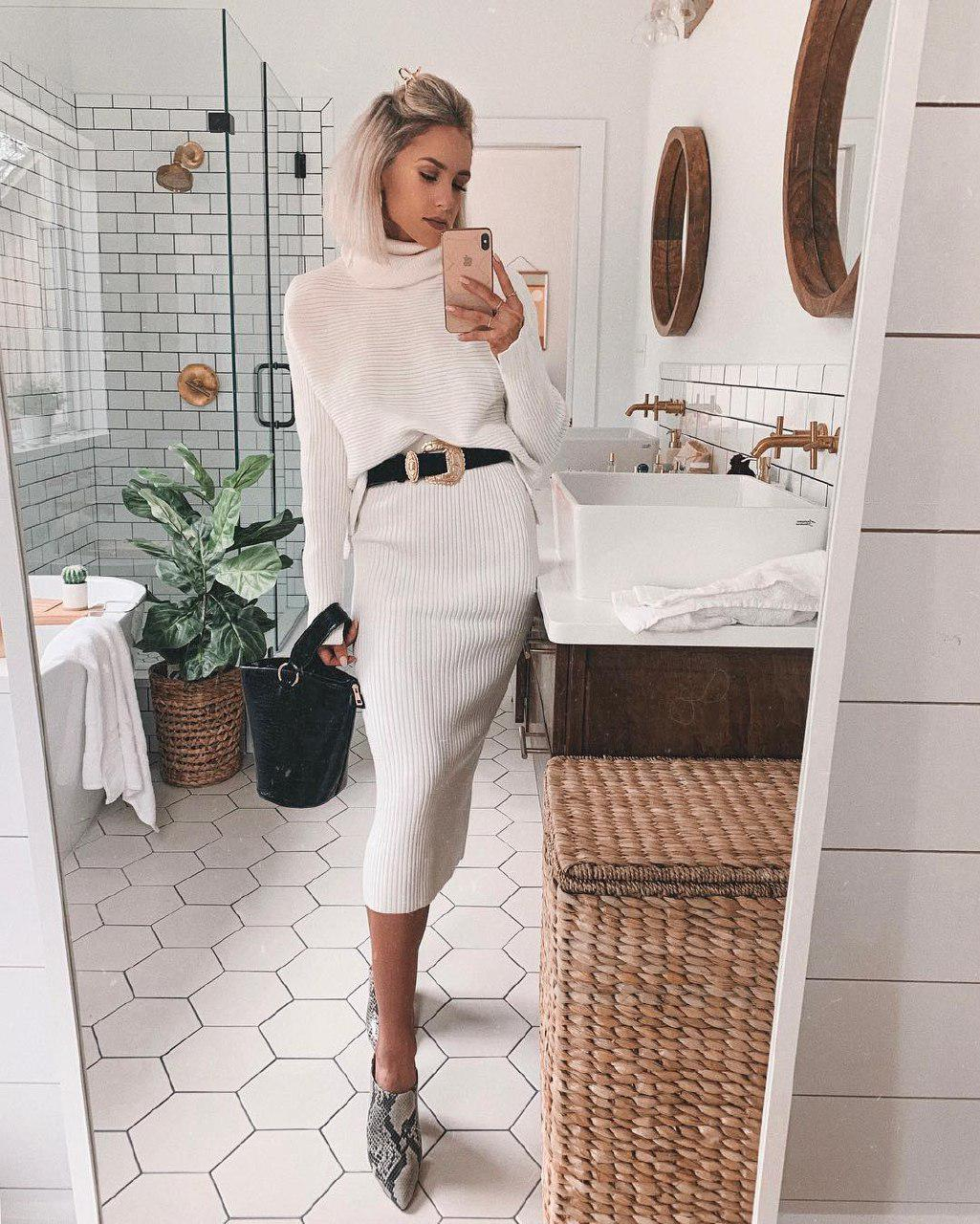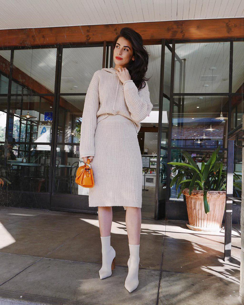 Перший аутфіт саме такий — трикотажний або в'язаний комплект зі спідницею. Це більш розслаблена і затишна альтернатива традиційному костюму, вдягнути яку можна з будь-якого приводу.