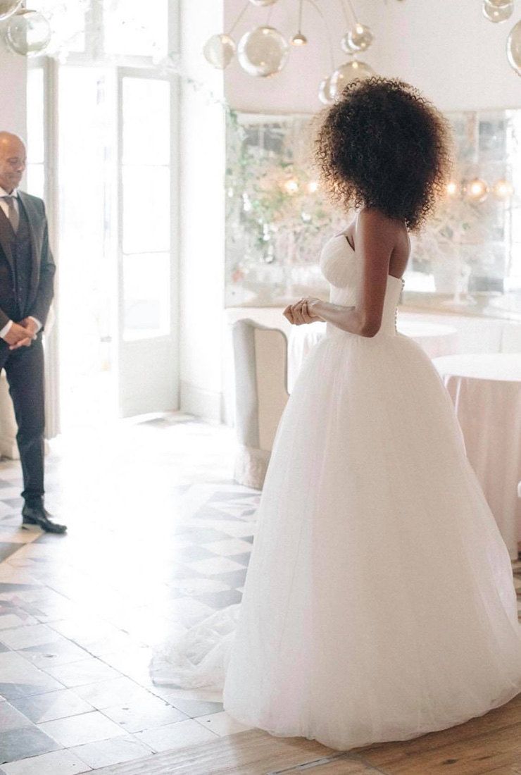 Нагадуємо, що ніжна сукня Тіни - робота популярного бренду Vera Wang. Венсан ж одягнув лляний костюм та світло-рожеву сорочку.