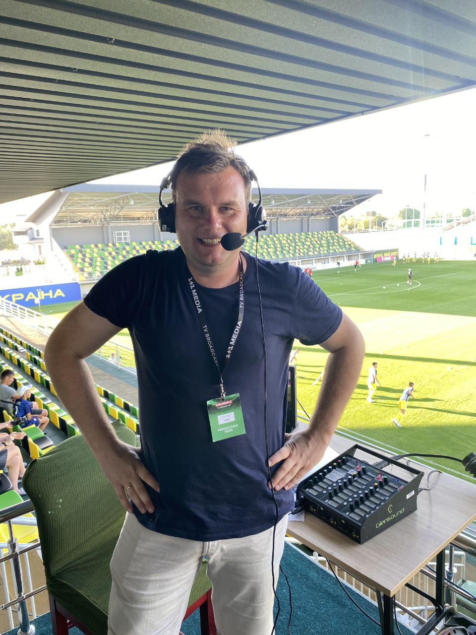 В той час, коли стало відомо, що футбольні команди проводитимуть благодійні матчі, бо ми брали в них участь, як коментатори. Одного разу, під час матчу «Динамо» ми з колегою Олександром Мельниченком почули гучний вибух. Після цього інтерес до того, що відбувалося на футбольному полі, суттєво впав. Пізніше, як виявилось, всього за кілька кілометрів від нашої студії впали уламки від ракети.