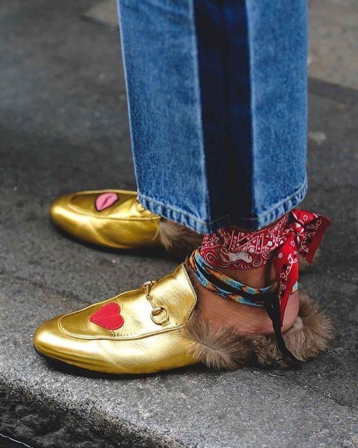 Ультрамодний вигляд мають бабуші з хутром у стилі Gucci. Їх експресивність можна зменшити, одягнувши улюблені mom-jeans.