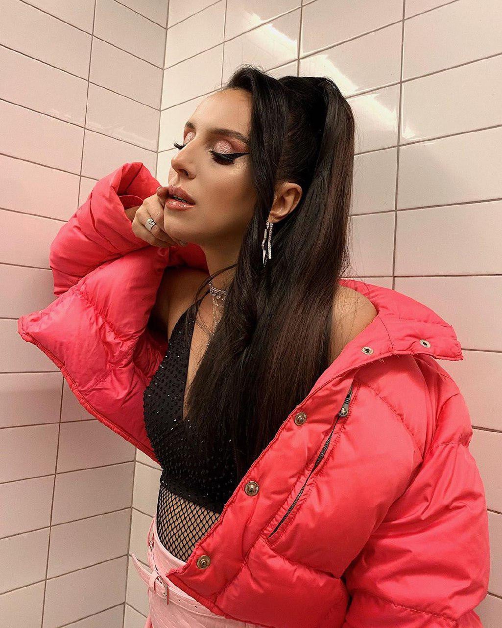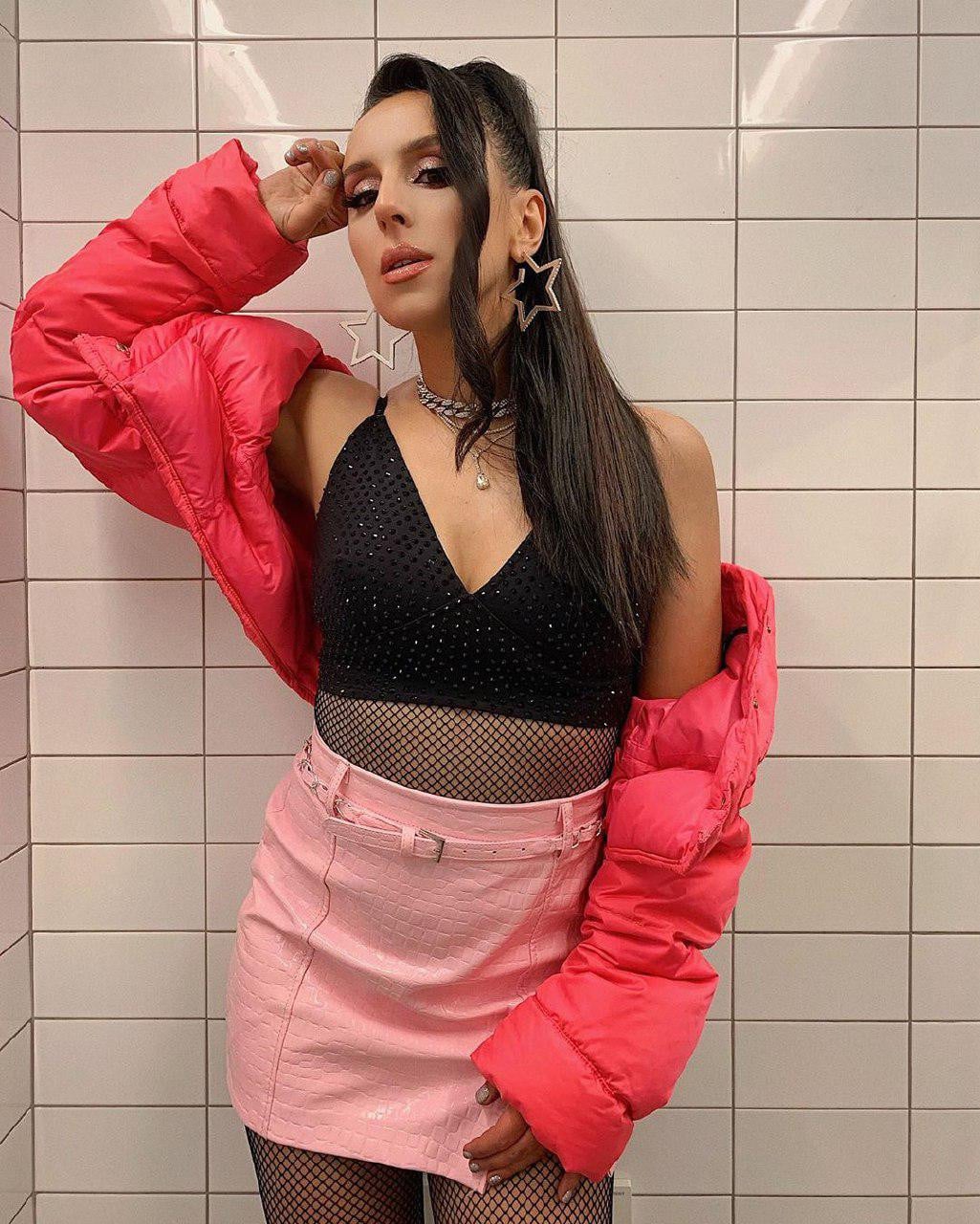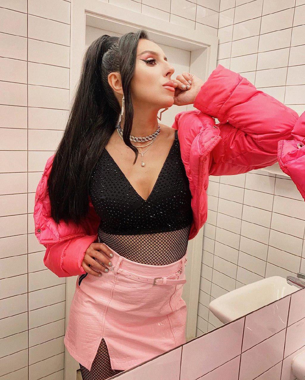 Джа надихнулася стилем популярної співачки Аріани Ґранде. На ній – спокусливе чорне боді, рожева спідниця міні та вкорочена куртка. Доповнили образ сережки у формі зірок, трендові ланцюжки на шиї, макіяж із блискітками і фірмова зачіска Ґранде – високий хвіст.