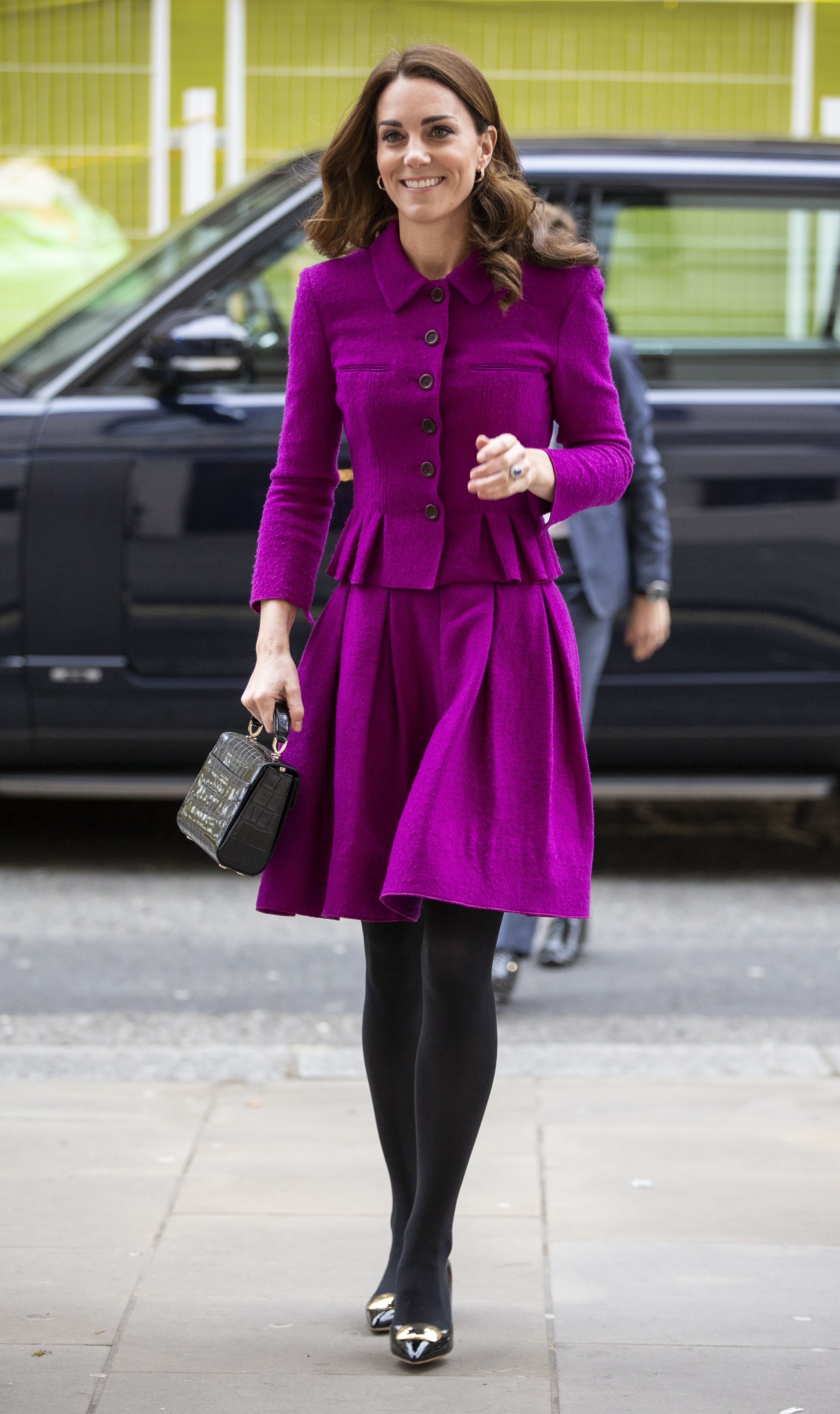 Цікаво, що в цьому ультрафіолетовому костюмі дружина принца Вільяма з’являлася на одному з заходів два роки тому. Якщо тоді, вона зупинила свій вибір на чорних туфлях без прикрас та клатчі, то цього разу доповнила образ чорними колготами, туфлями з золотою брошкою від Rupert Sanderson та маленькою сумкою з ручкою.