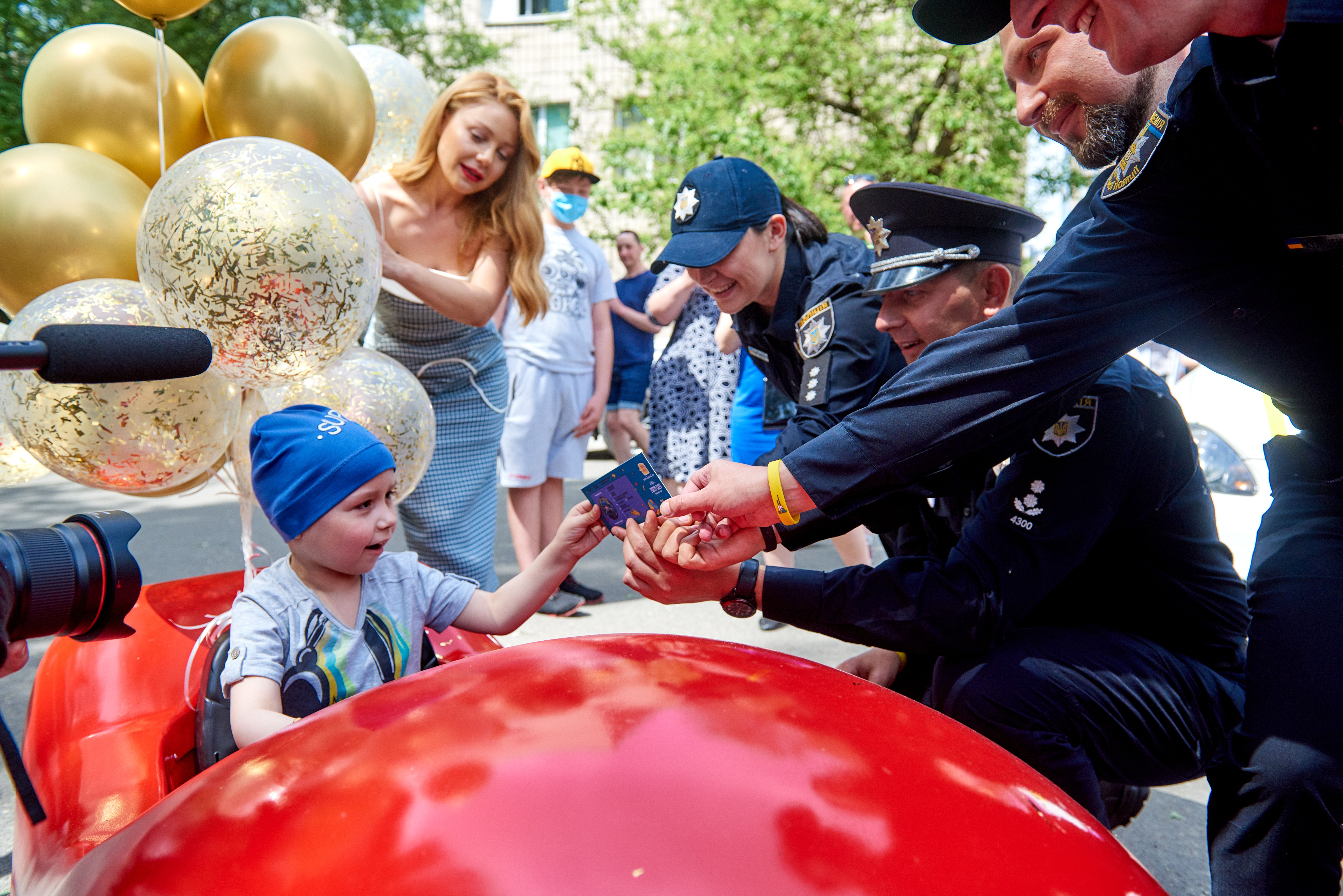 А коли Ромчик побачив власну мініверсію авто – проїхав у ньому десяток кіл навколо лікарняних корпусів. На цьому авто хлопчик буде їздити на Хмельниччині біля дому й не тільки. Для серйозності моменту поліцейські вручили хлопчику на згадку символічне водійське посвідчення. Тепер він справжній автомобіліст!
