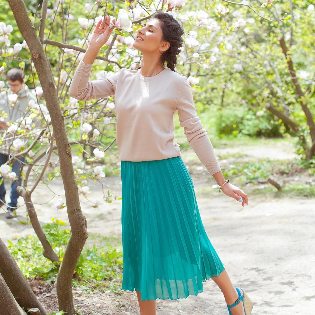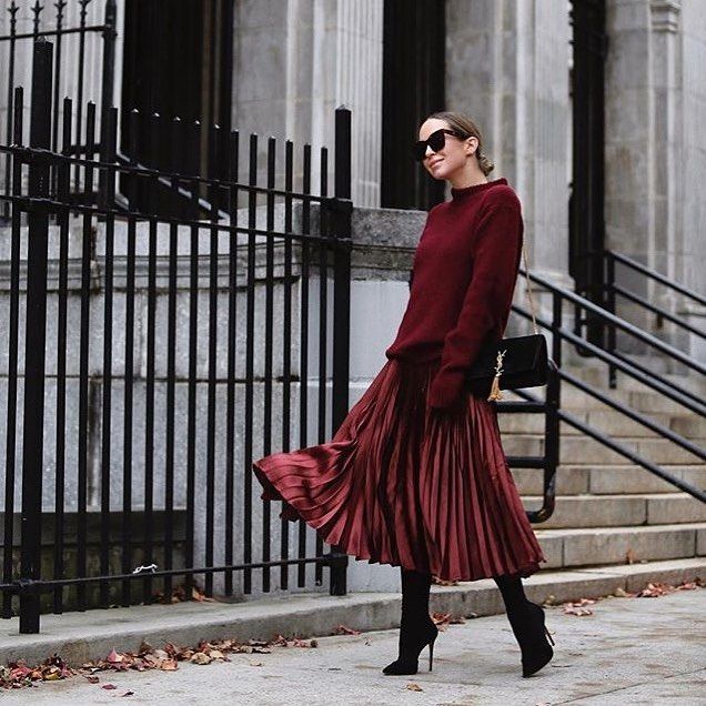 Граційні плісировки міді-довжини тримаються у тренді вже не перший сезон. Вони полюбилися модницям через свою універсальність. Якщо раніше такі спідниці поєднували лише із блузами та підборами, то зараз обмежень у комбінуванні плісировок немає. Дизайнери пропонують вдягати цей предмет гардеробу зі світшотом під зухвалі чоботи або ботильйони.