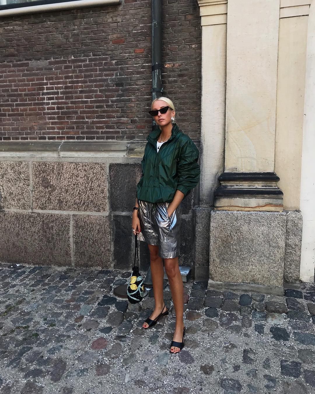 Не отказывайтесь от блеска и в повседневных луках. Ищите удачное сочетание. Так, спортивную куртку можно дополнить неординарными шортами-велосипедками цвета металлик.