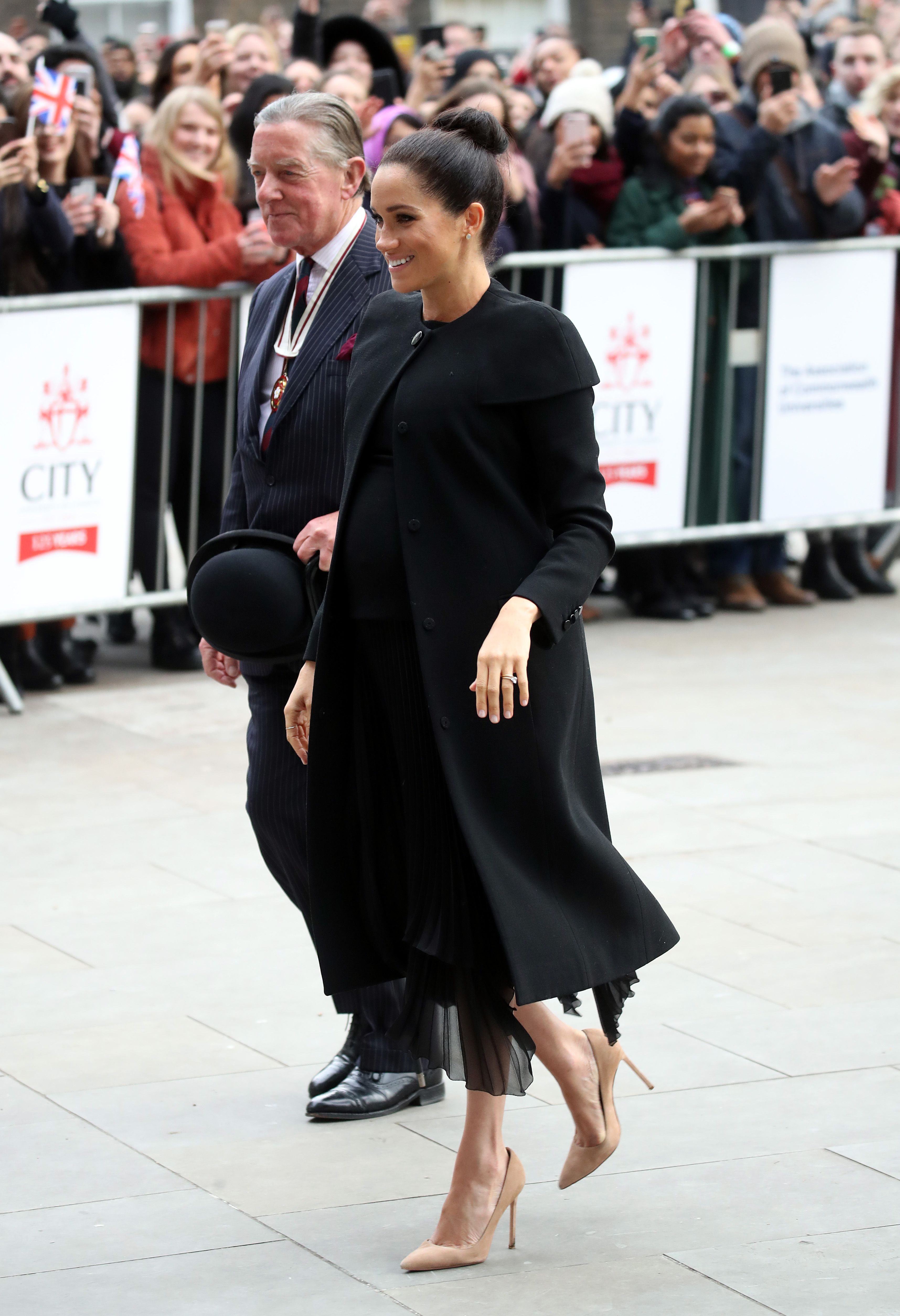 Наступний вихід дружини принца Гаррі був не менш ефектним. Меган відвідала Асоціацію університетів Співдружності, де зачарувала total black образом: сукнею та пальто від Givenchy, улюбленими бежевими туфлями-човниками від Manolo Blahnik’s, лаконічною зачіскою-пучком та мінімалістичними прикрасами.