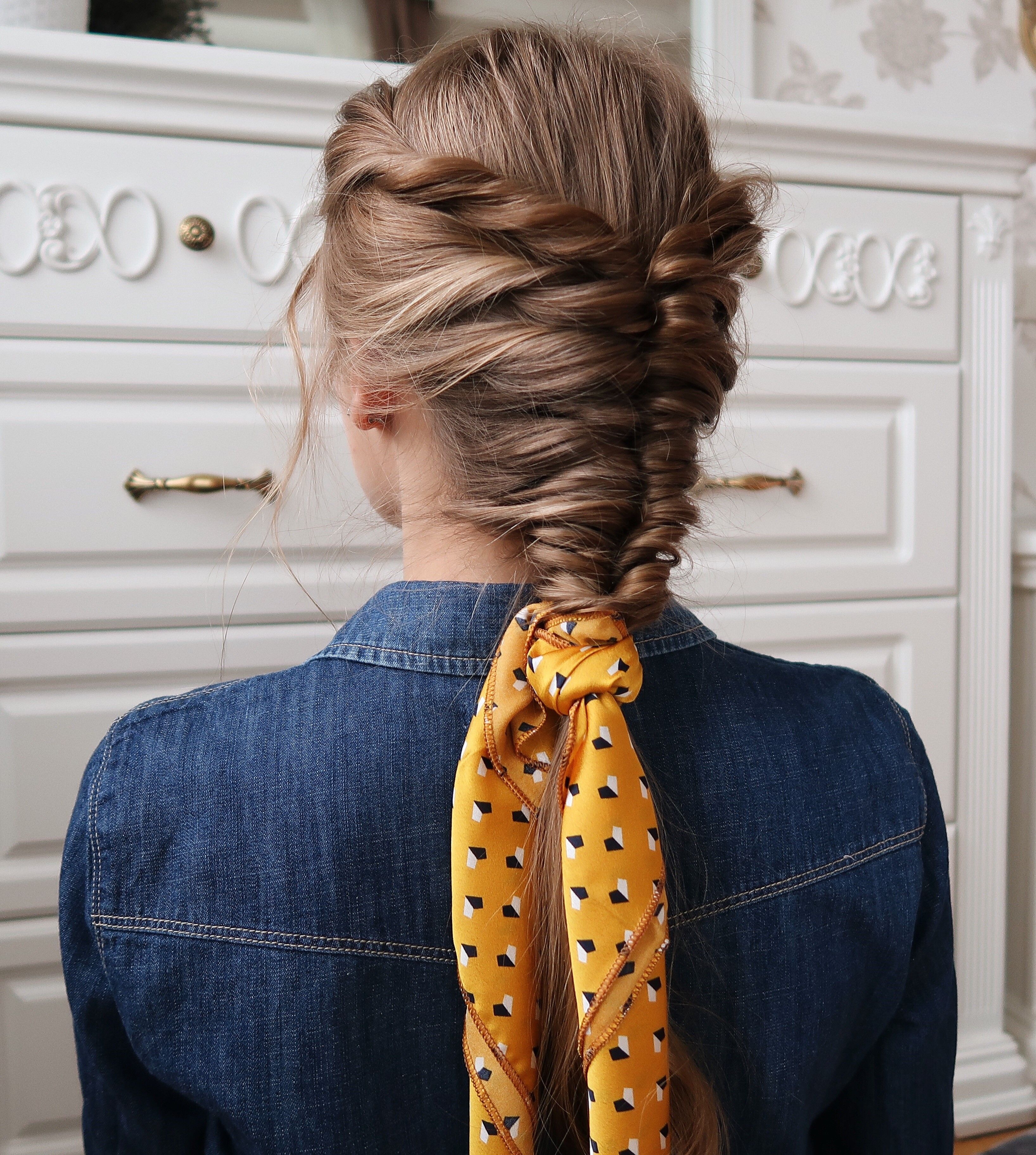 3. Закріпити хустинку на волоссі й заплести її у звичайну косу. Закріпити резинкою внизу.