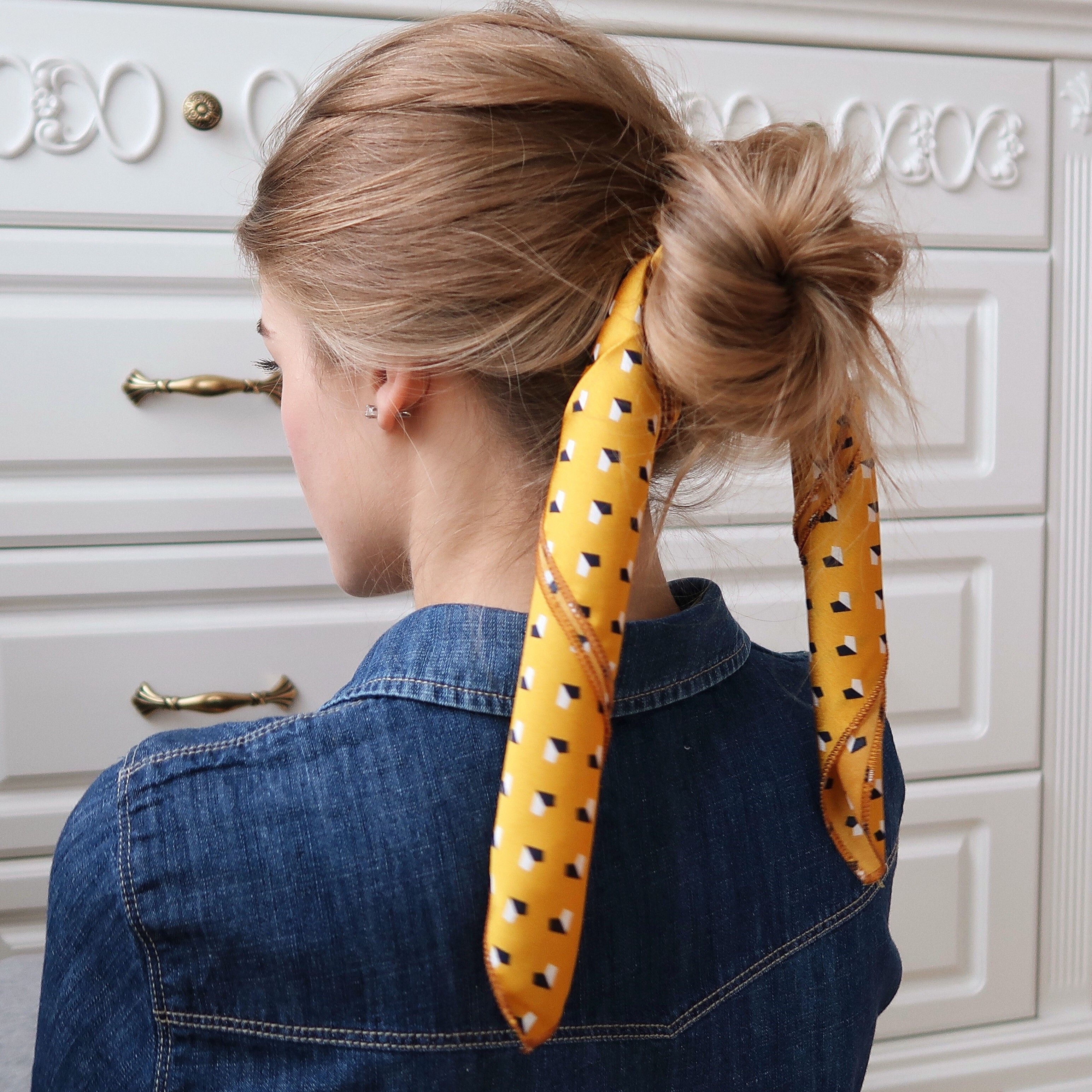 2. Повторити рухи і закріпити волосся внизу резинкою. Зав’язати хвіст хустинкою у вузол.