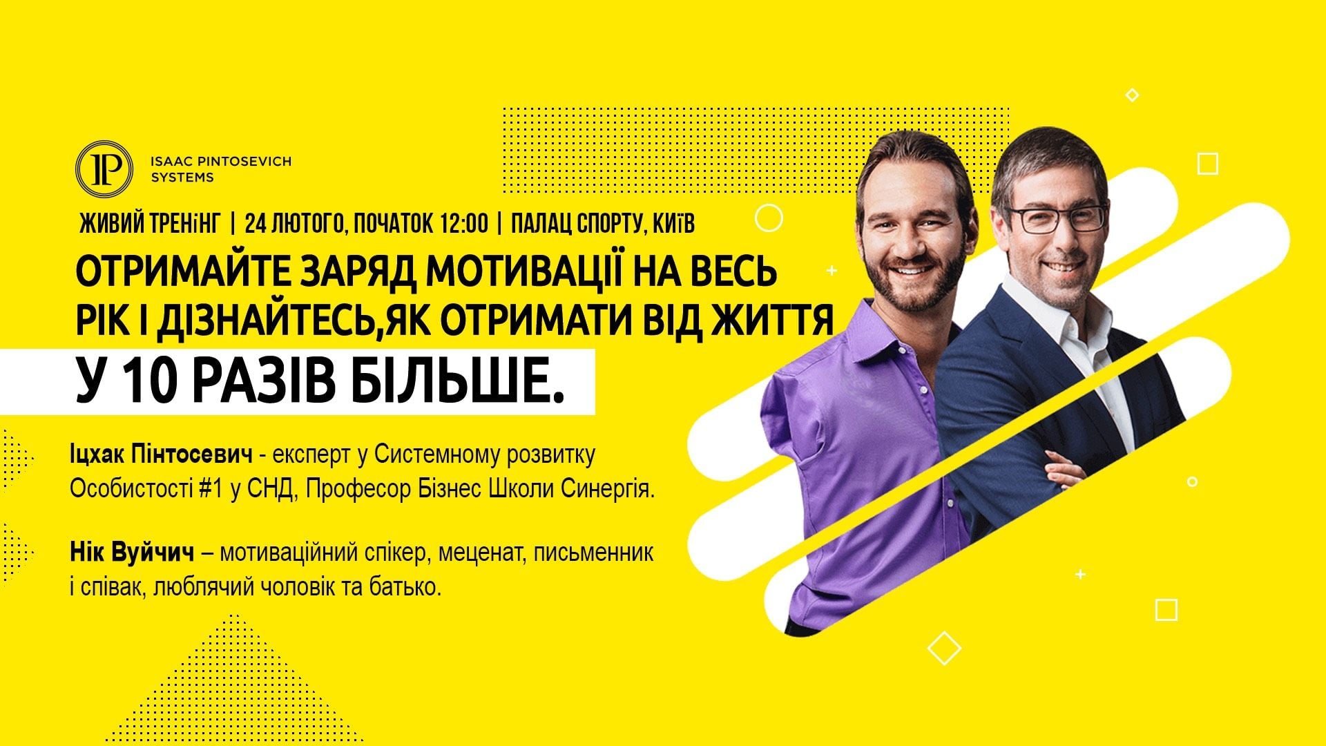 24 лютого в Києві, в Палаці спорту пройде 7-годинний тренінг «Переможець лінощів. Життя без кордонів». Під час заходу виступатимуть два топових мотиваційних спікера: Іцхак Пінтосевич і Нік Вуйчич.