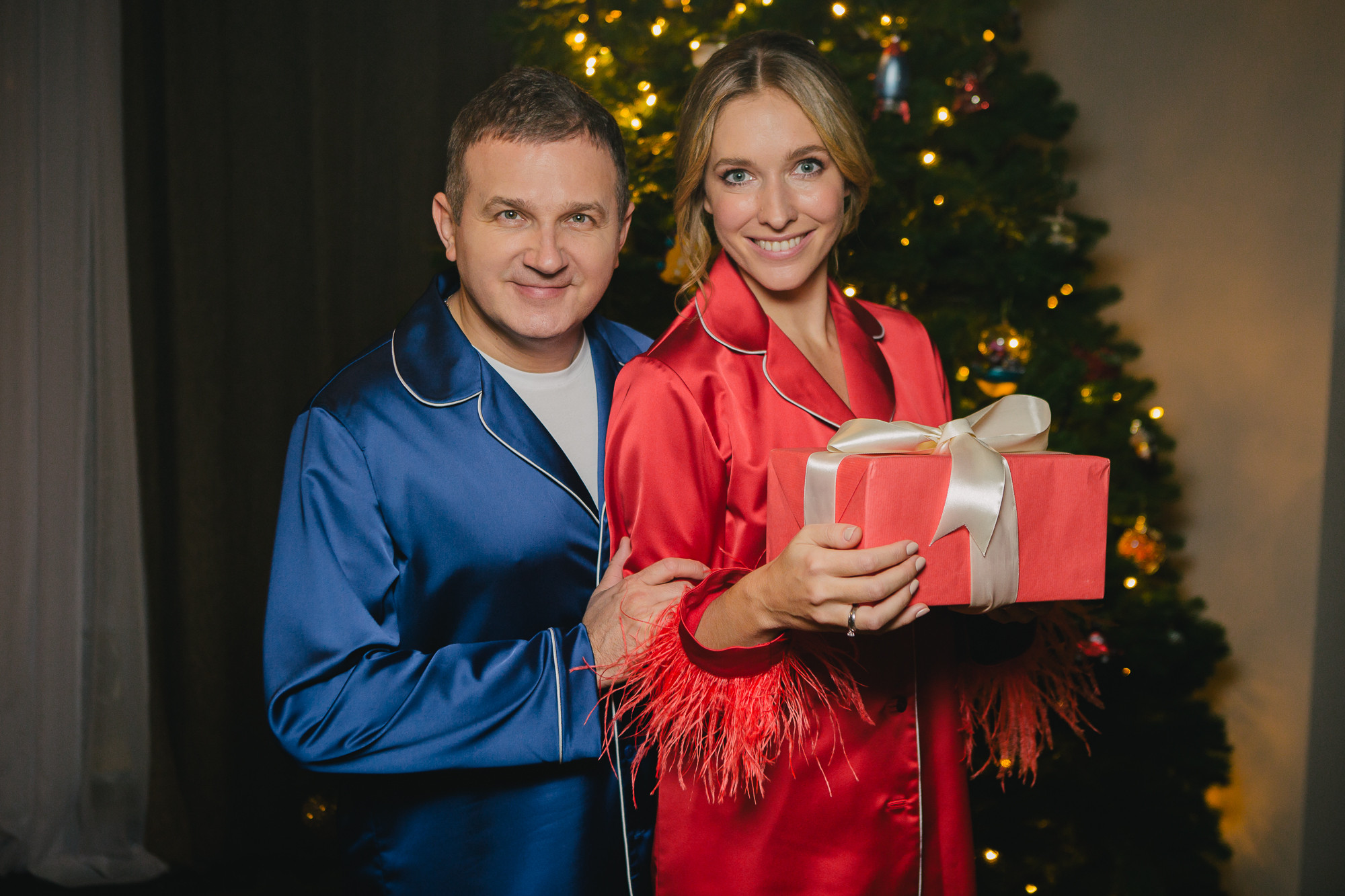 А подружжя ведучих Юрія Горбунова та Катерини Осадчої із засніжених Альп з ідеальним краєвидом за вікном переносяться у затишну домашню атмосферу. Опинившись вдома біля ялинки у піжамах, вони обмінюються зворушливими маленькими подарунками.