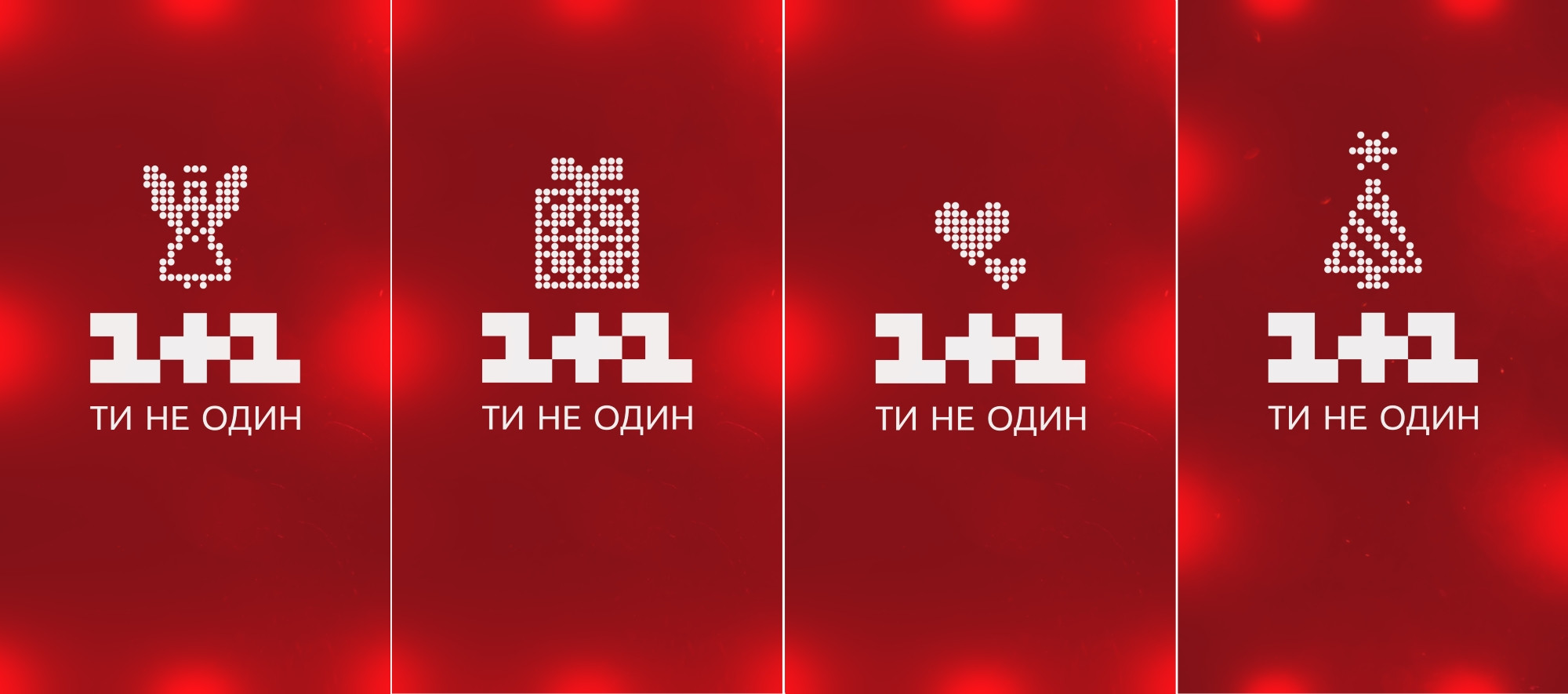 Креативна ідея знайшла своє відображення й у новорічному оформленні. В основі святкового віжуалу — гірлянда, яка зазвичай асоціюється з Новими роком. Зокрема, святковими вогниками тепер замерехтів і логотип 1+1. За задумом дизайнерів, така тепла різдвяна графіка зігріватиме глядачів у холодні зимові дні. Крім того, для зимових свят 1+1 розробив чотири варіанти скрін-лого, додавши головні символи — сніжинку, ялинку, янголів та серця. Вони змінюватимуться на Новий рік, Різдво та День Святого Валентина. Спеціально для новорічної кампанії 1+1 отримав права на нову пісню Роббі Вільямса Merry Xmas Everybody. Вона звучить у промо-роликах, а також у джазовій обробці у традиційному джинглі «Ти не один».