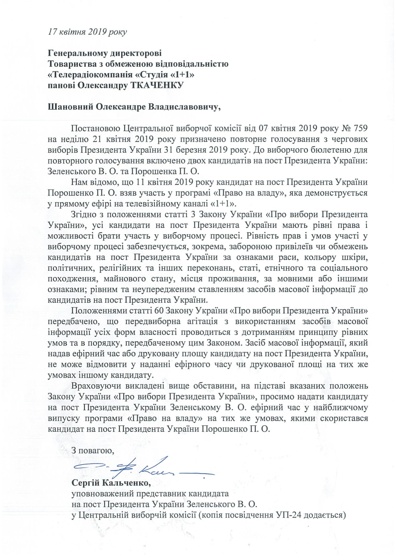 Сьогодні, 18 квітня, кандидат у президенти Володимир Зеленський завітає до студії суспільно-політичного ток-шоу Право на владу на каналі 1+1. Вчора до редакції проекту надійшов офіційний лист від штабу Володимира Зеленського, у якому посилаючись на Закон «Про вибори Президента України», міститься вимога надати їхньому кандидату ефірний час у найближчому випуску Право на владу.