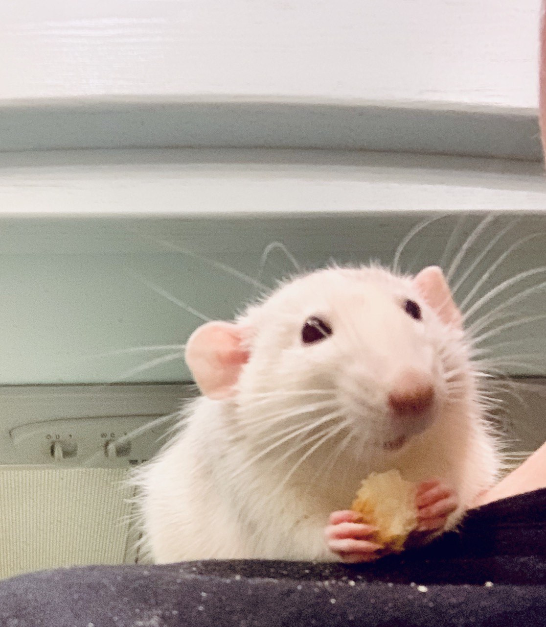Очень, я б сказала, такая коммуникабельная крыска. Он эфир у нас вёл однажды. Сидел у меня на плече тоже пол-эфира, я даже была удивлена, как он себя вежливо, культурно ведёт.