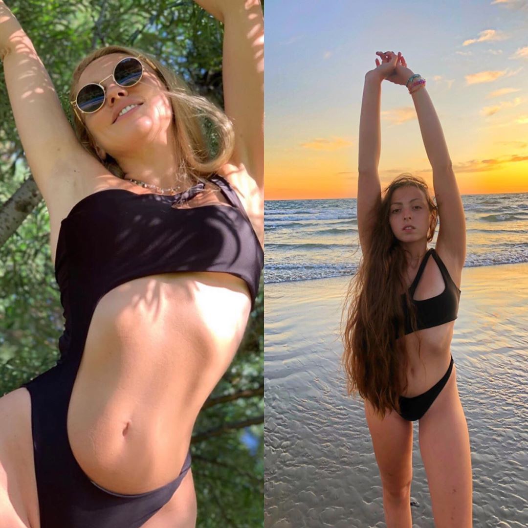На фотоколлаже певица и ее дочка позируют в сплошном черном купальнике ассиметричного кроя. В комментарии к фотографии Маша рассказала, что сейчас находится в Америке и очень скучает по маме.