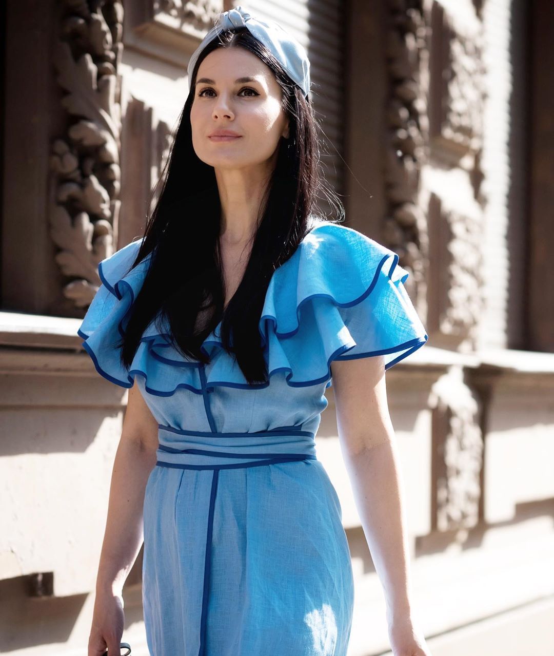 Звезда надела нежное платье небесно-голубого цвета с поясом от украинского бренда B.O.Y, а дополнила его стильным аксессуаром – платком для волос Prada. Подписчики полюбили образ ведущей и поделились впечатлениями:«Какая красивая», «Как лебедка».
