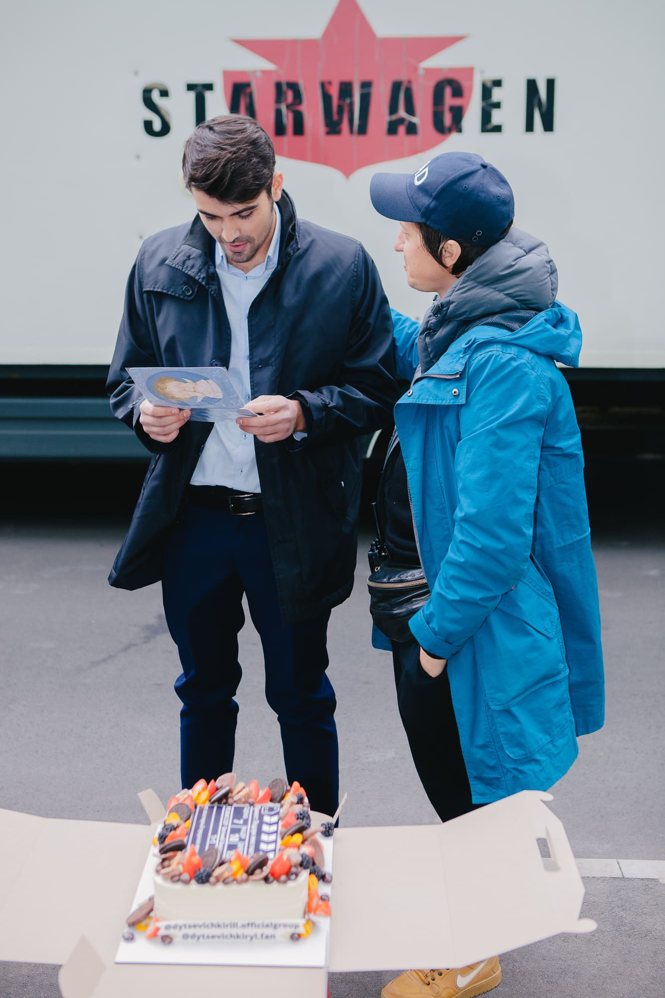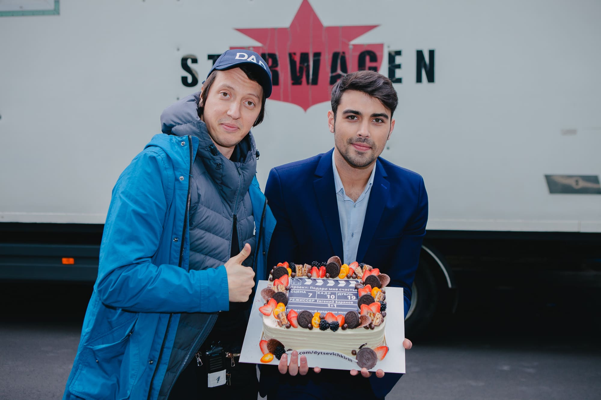 Совершенно неожиданно на площадку привезли торт с запиской. Оказалось, что фан-клуб Кирилла Дицевича решил порадовать любимого актера. Поводом стала седьмая совместная работа кинозвезды с режиссером Евгением Барановым, поэтому дата сюрприза также выбрана символично – 7 октября.