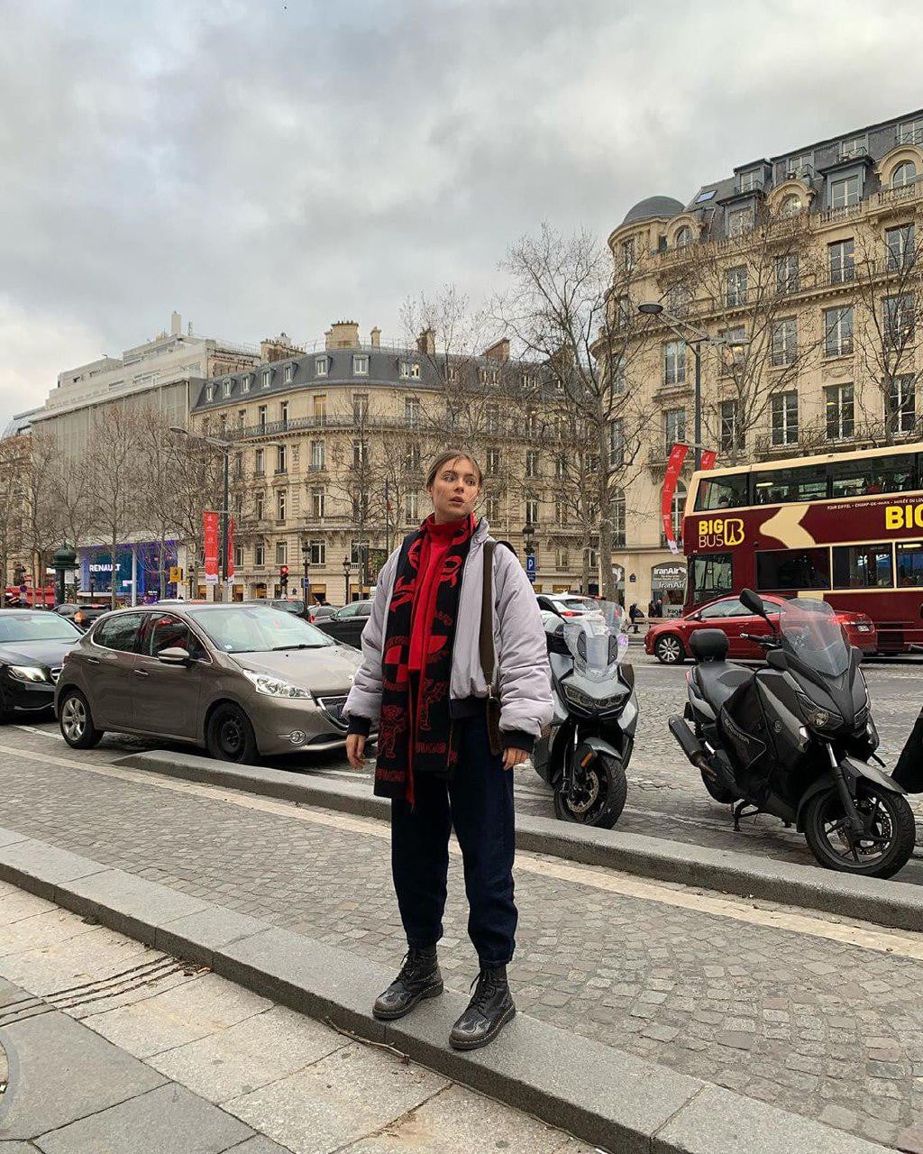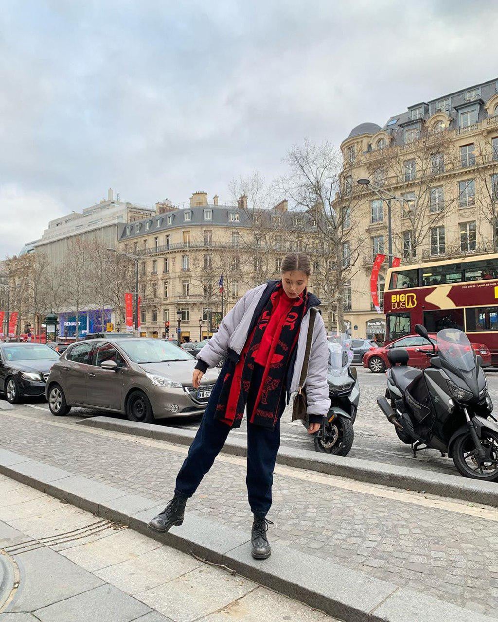 Также Маша Кравец дополнила свой наряд интересными аксессуарами — красно-черным шарфом и минималистичной сумкой.
