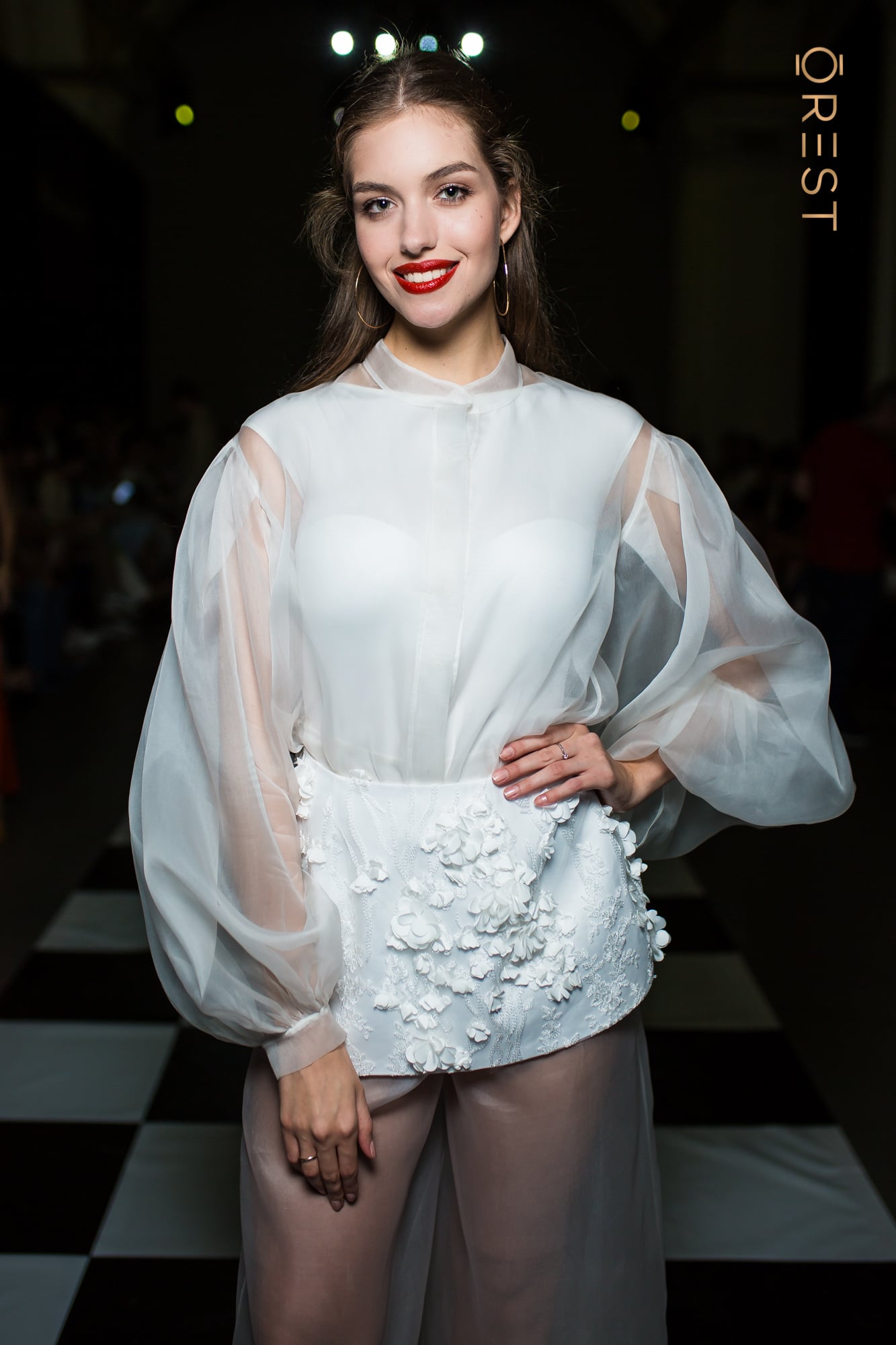 Модель выбрала невесомый костюм от Katerina Rutman. Полупрозрачное одеяние идеально подчеркивает хрупкую фигуру звезды. Костюм сшит из воздушного белого фатина. Он украшен нежным корсетом с цветами. Трендовые рукава-фонарики и укороченные брюки-кюлоты добавляют луку грации и легкости. А игривая красная помада прекрасно «играет» на контрасте.