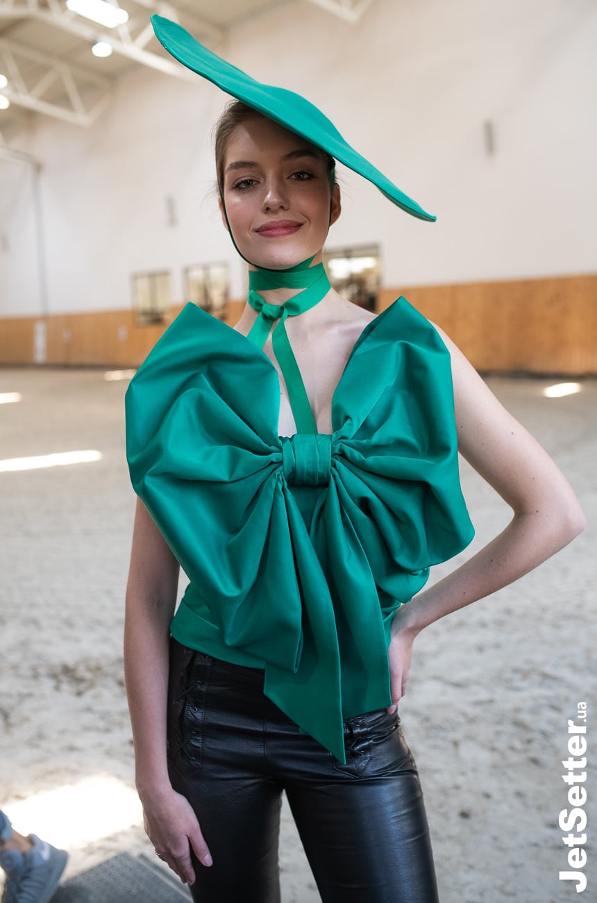 Другой наряд Саши кардинально отличается от предыдущего. Девушка решила сделать ставку на яркость и надела изумрудный топ с огромным бантом, шляпку в тон и кожаные брюки. Кстати, в новом сезоне ультрабольшие банты стали одним из самых громких трендов. Бери пример с Александры и украшай образ модной деталью.