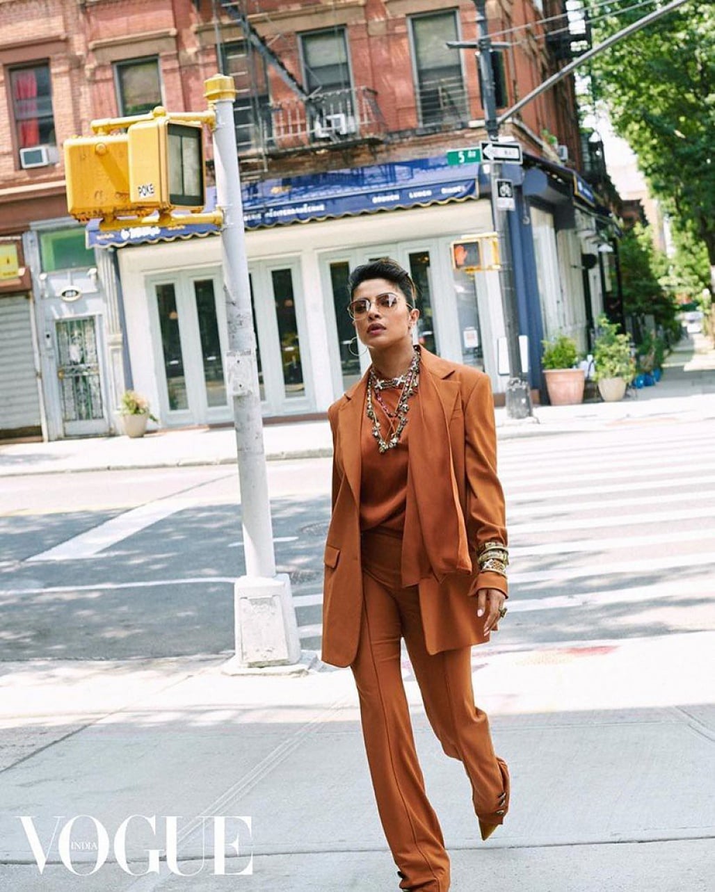 Напоследок звезда продемонстрировала три модных лука, которые стоит повторить этой осенью. Приянка Чопра облачались в два разных брючных костюма — ярко-зеленый с подчеркнутой линией плеч и акценом на талии, а затем — карамельный total.