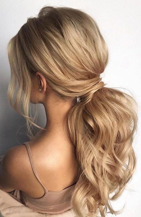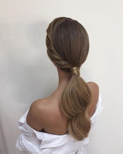 Прическа в стиле «небрежный хвост». Такая прическа придает образу легкости. Будет выглядеть так, будто вы очень быстро собрались на выпускной 2021, однако в то же время вы будете иметь хорошо уложенные волосы.