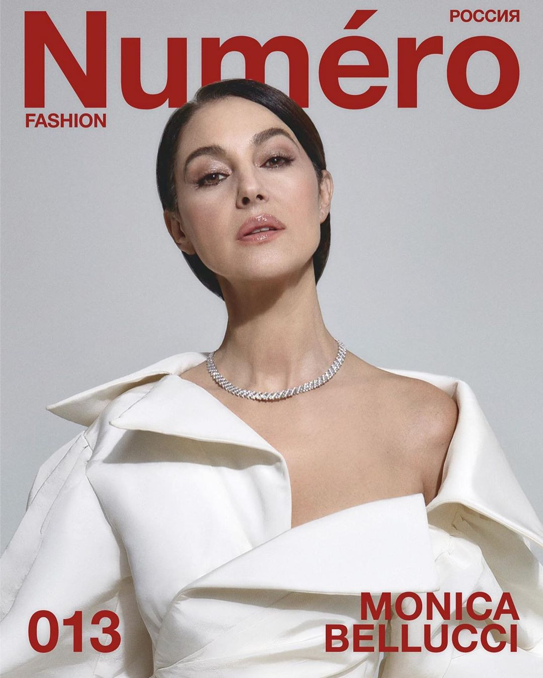 На обложке Моника позирует в белом асимметричном платье от Ashi Studio и изысканном бриллиантовом ожерелье.