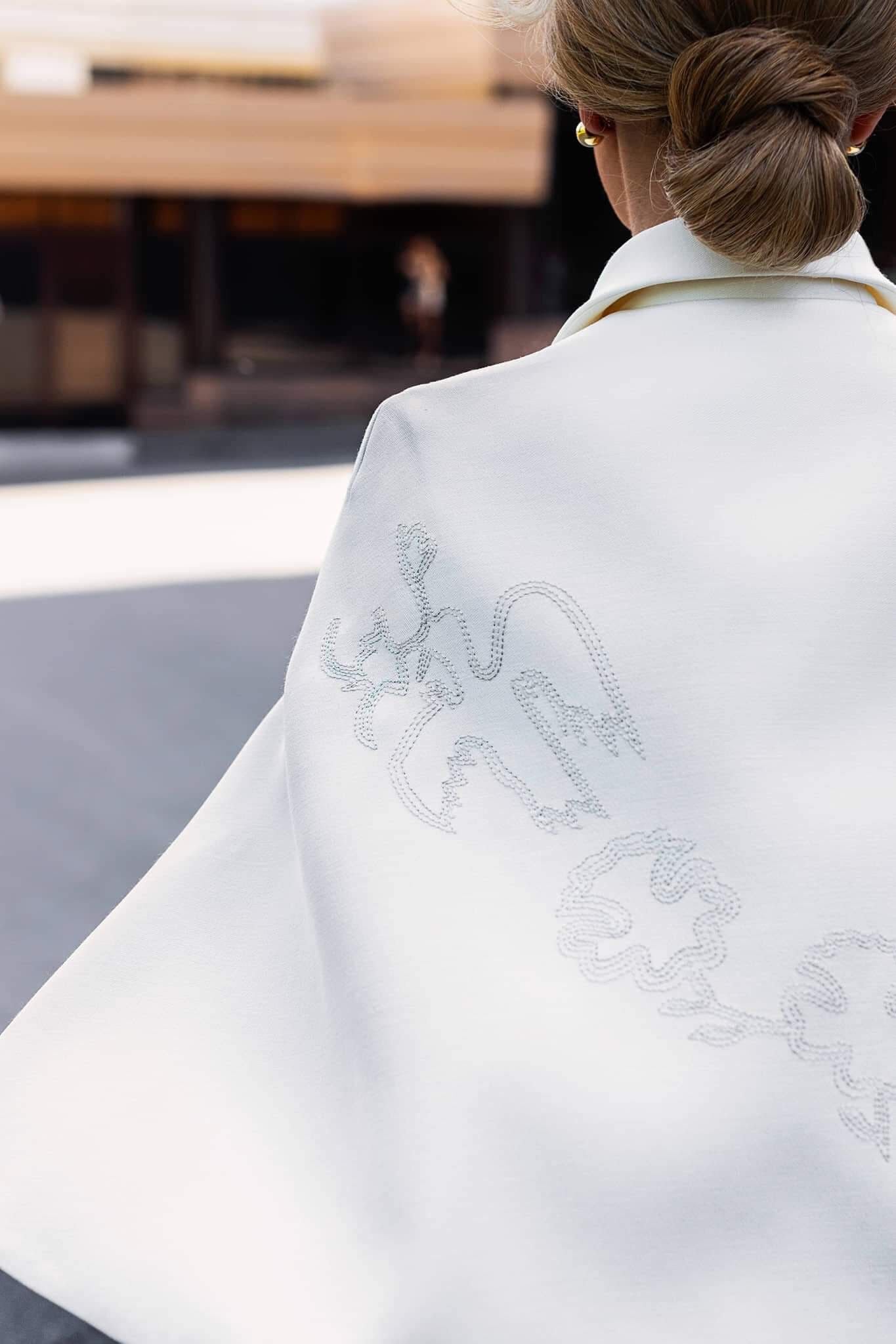 Студия ARTEMKLIMCHUK известна вниманием к деталям и сочетанием украинских традиций с современной модой. Не стала исключением и одежда первой леди. Для оформления рукавов платья и кейпа мастера вышивки использовали традиционные украинские артизанальные техники, адаптируя флористические и анималистические мотивы с ковров Сумщины и Полтавщины начала XIX века. Расположение элементов на кейпе вдохновленное символизмом древнего Триполья.