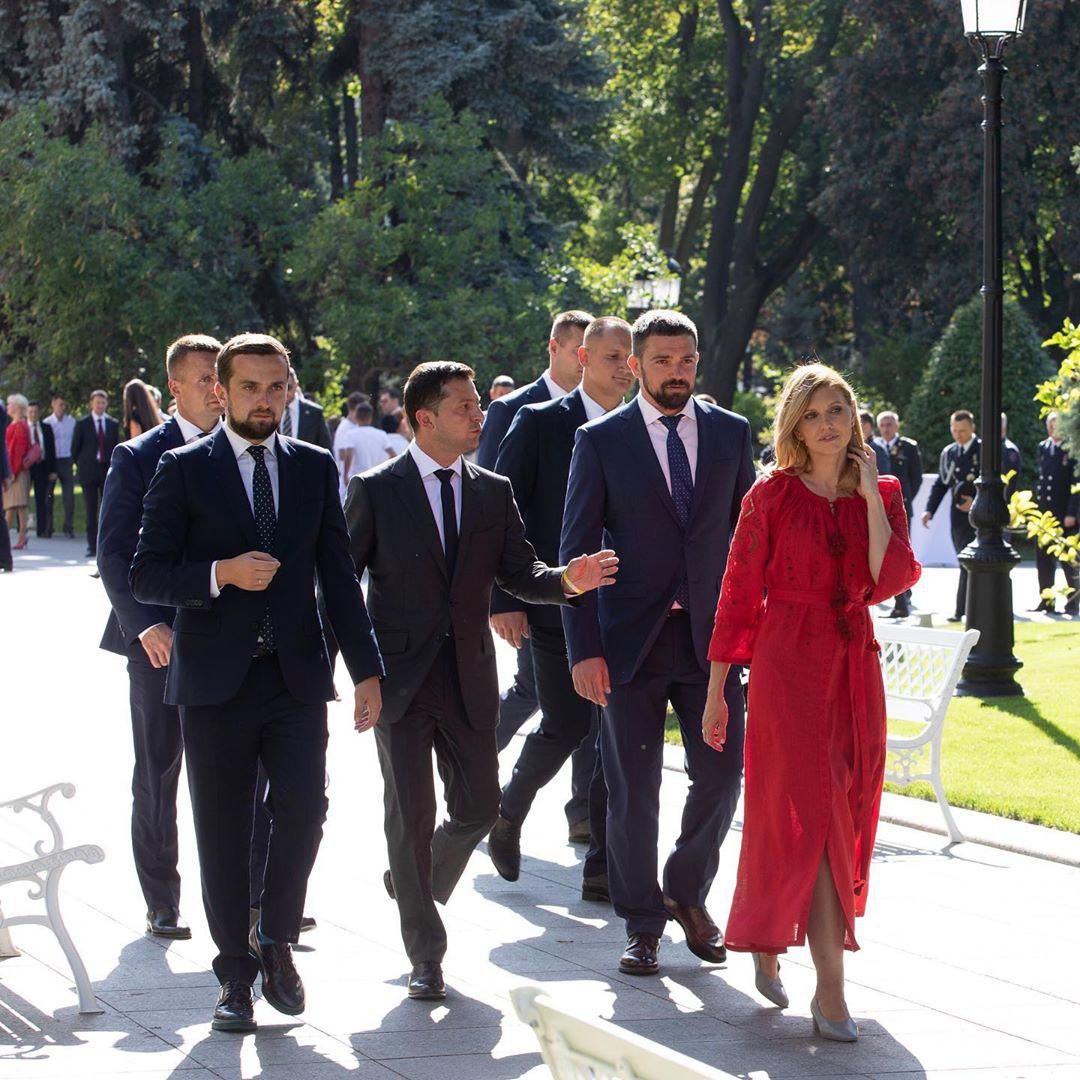 Красное приталенное платье-вышиванка действительно невероятно идет Елене. Образ с ним первая леди дополнила своими любимыми бежевыми лодочками.