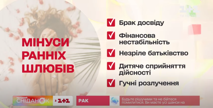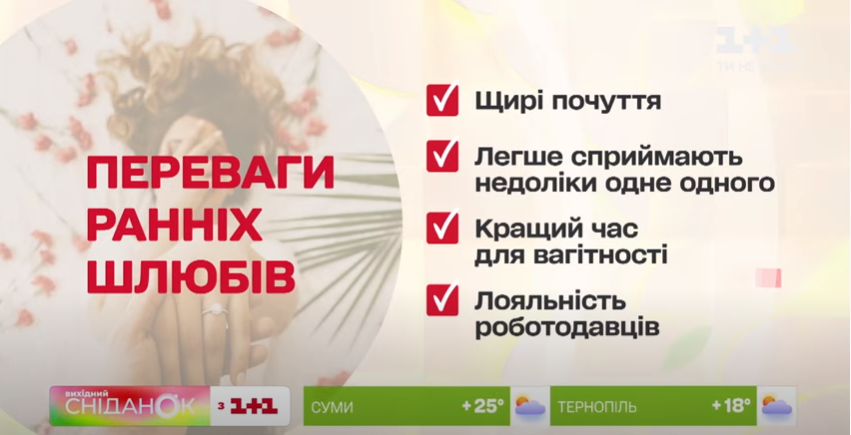 Вокруг ранних браков (т.е. до 25 лет) существует много суждений: пары слишком эмоциональные, молодожены не готовы к ответственности и то, что такие браки обязательно распадутся. Сегодня в студии утреннего шоу "Завтрак. Выходной" психолог Наталья Ломоносова поговорит об этих суждениях, а также расскажет о преимуществах ранних браков.