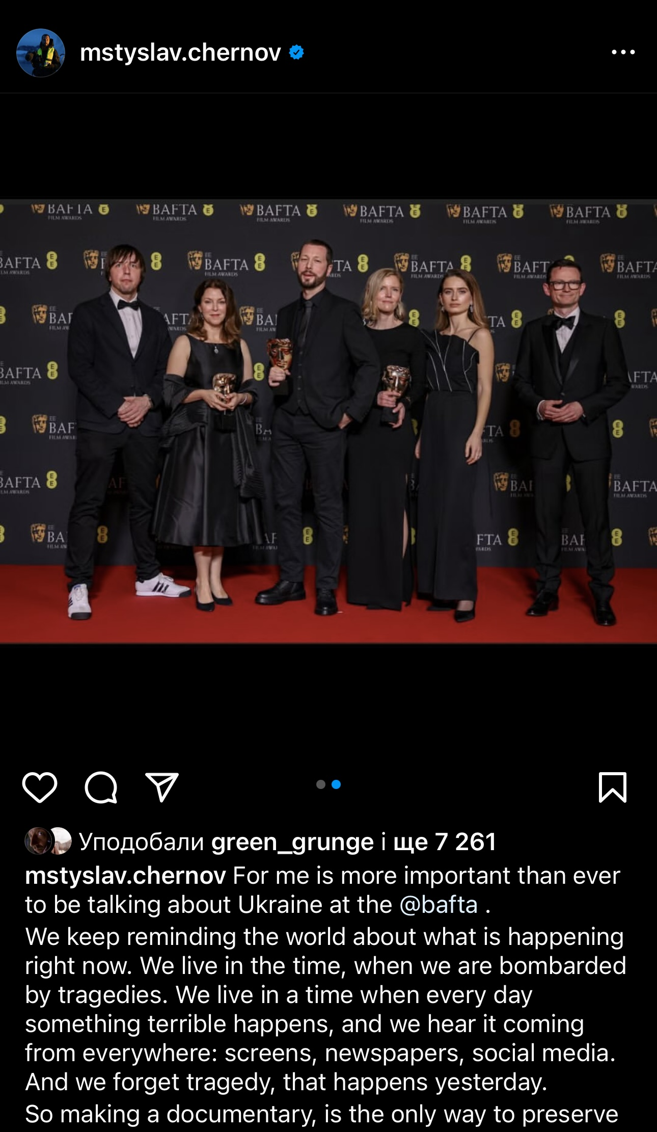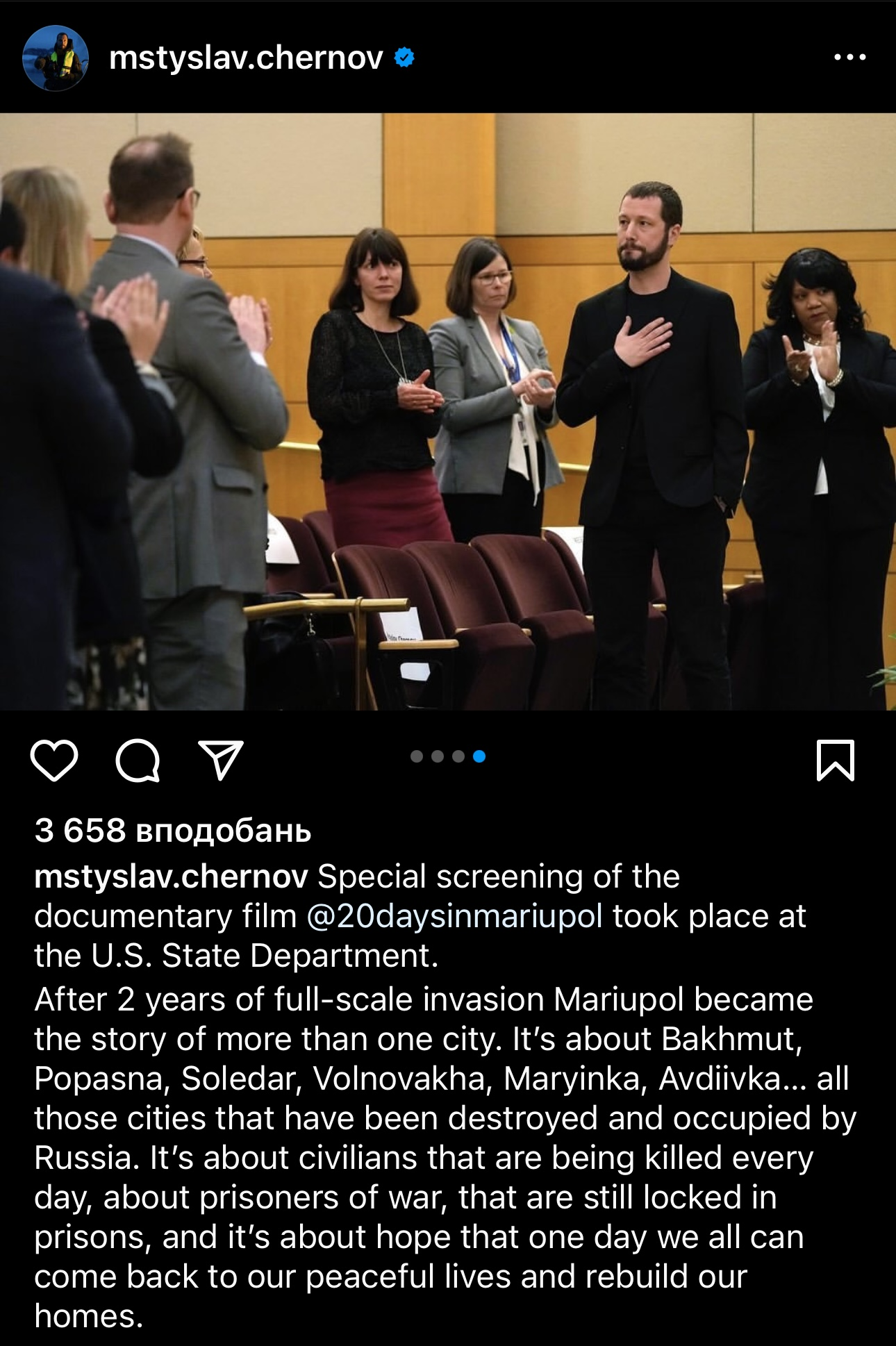 Фильм «20 дней в Мариуполе» является настоящим актом героизма трех украинских журналистов, снимавших преступления России во время уничтожения города. Режиссер картины Мстислав Чернов активно популяризирует Украину среди мирового коммьюнити.