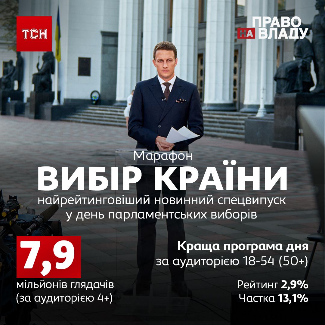 Информационный блок 1+1, который состоял из выпусков ТСН и спецвыпуска «Право на власть», уверенно лидировал в прайме. По аудитории 18-54 (50+) доля составила 13.1%, рейтинг 2,9% по аудитории 18-54 (Украина) доля составила 12,2%, рейтинг 2,7%. Общий охват 6-часового марафона «Выбор страны» составил 7,9 миллионов зрителей (по аудитории 4+). Это самый высокий показатель среди украинских телеканалов.